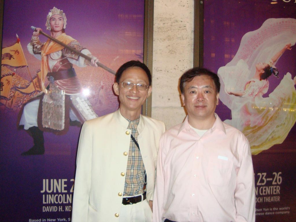 中国基督徒民主党发言人陆东与八九民运领袖刘刚观看神韵六月在林肯中心的首场演出