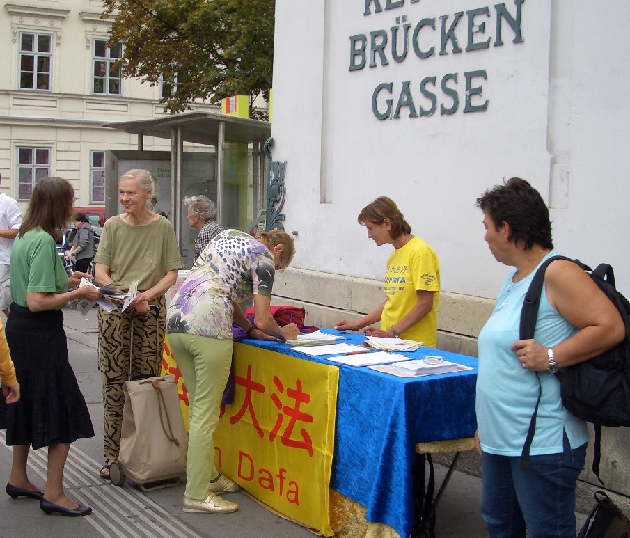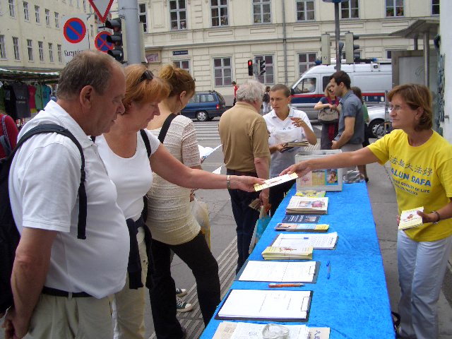 法轮大法的真相点就设在地铁站的维也纳华人商埠区的出口,经过这里的人非常多。法轮大法真相点附近是维也纳的古董和旧物交易市场,这个交易市场很受游人和奥地利本土人的喜爱。熙熙攘攘的人群为学员们讲真相促三退提供了方便的条件。有波兰人和匈牙利人拿取印有他们母语的法轮大法真相资料;有了解真相的欧洲民众在支持法轮大法的留言版上签名;有位印度尼西亚的华侨详细询问了法轮大法在维也纳的炼功点信息,并请学员把炼功时间和地点帮她写在纸上。