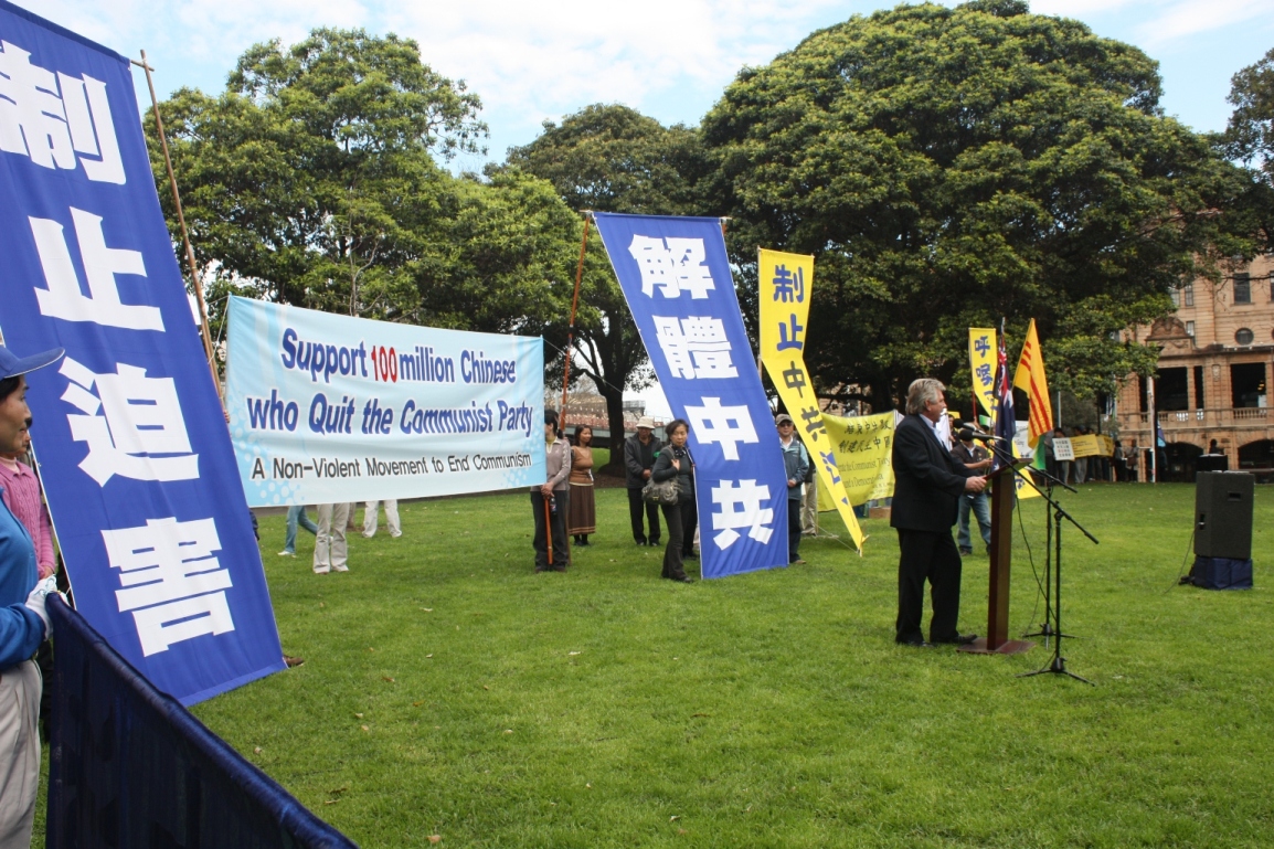 中国工党主席方圆先生在发言中说:“今年是掀起退党大潮的第七年,七年来一亿人退出了中共邪党及其附属组织,二零零五年的四月二十三日,我们在悉尼声援百万仁人志士的退党,二零零六年四月八日,也在悉尼,我们声援千万仁人志士的退党,今天,我们声援一亿仁人志士退党。八千万的党员中,我相信已有很多人秘密地退出了中国共产党,还有些人留在共产党内更多的是为了现实利益,我相信没有人真正喜欢中共的暴政,二十一年前,所谓的社会主义阵营即将走向崩溃的时候,波兰在一九八零年初有三百万共产党员,到了一九八一年秋天,就减少了一百万,后来东欧也有近半数的人退党,罗马尼亚共产党员是全部退出了共产党,苏联共产党到了一九九一年只有四个党员,这就是历史。中国的共产党迟早也会退垮它的。我相信中国人民期盼着早日结束中共暴政。”