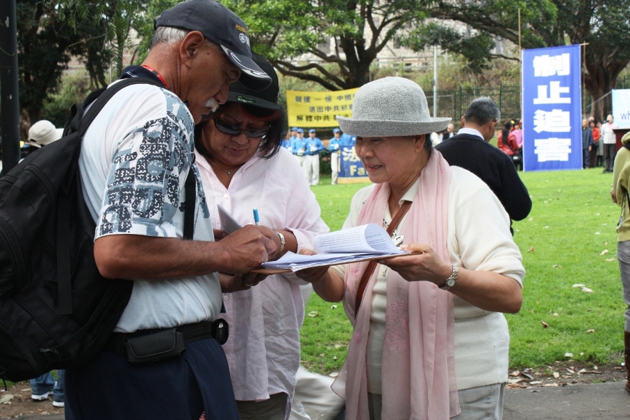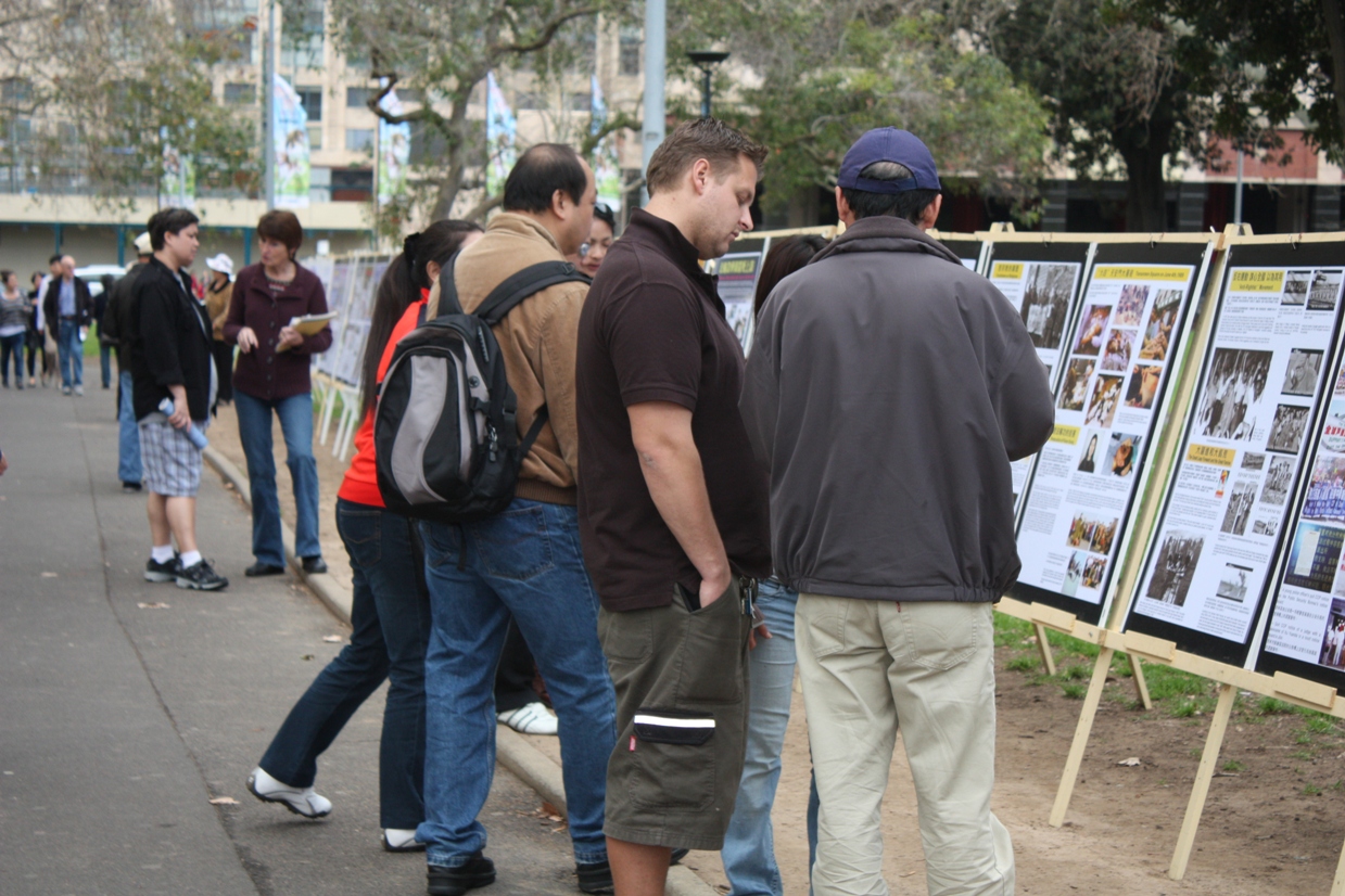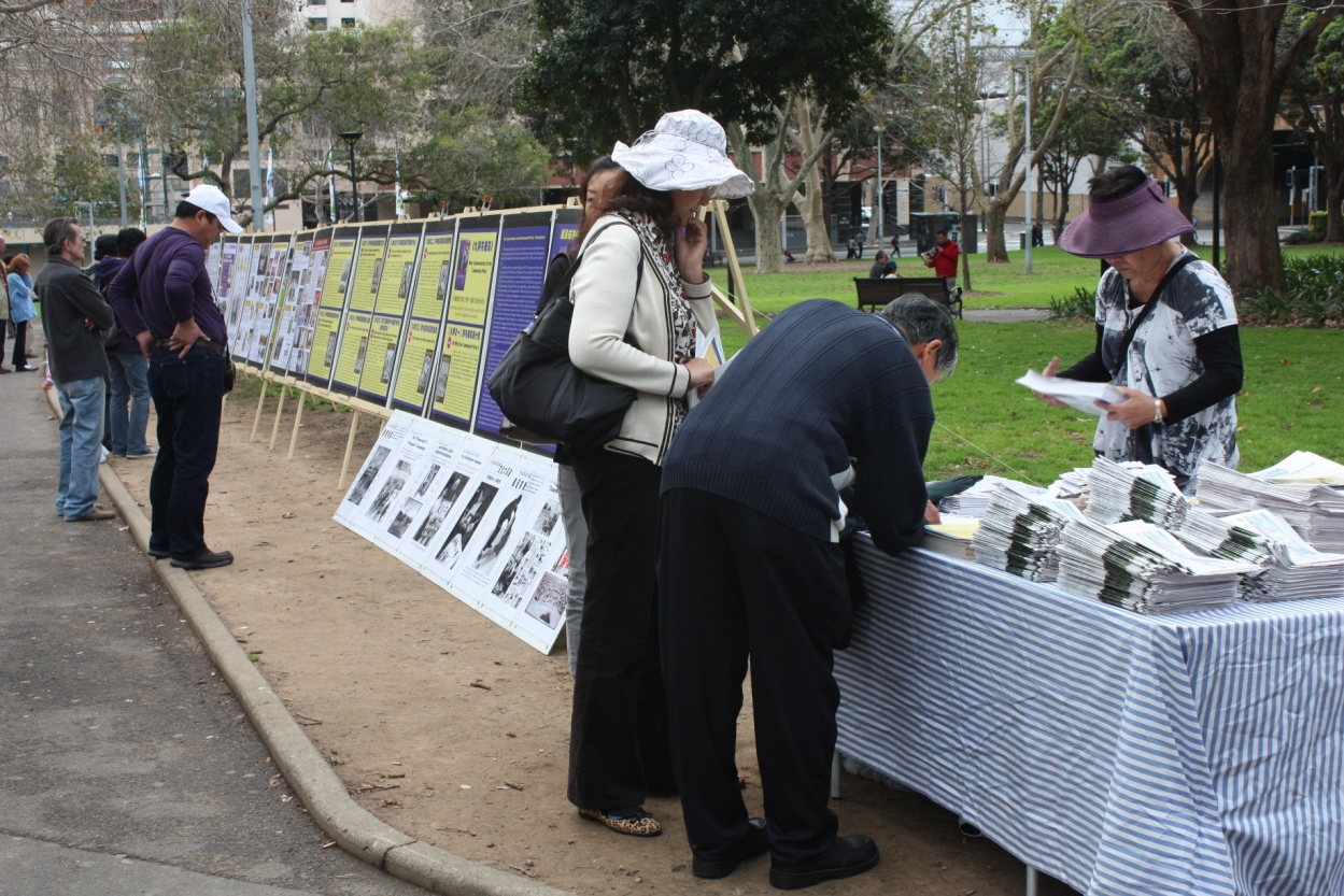 在活动的过程中,熙熙攘攘的人群往返于集会附近。悉尼退党服务中心的义工们拉开“解体中共,制止迫害”、“制止中共迫害,呼唤正义良知”等巨大横幅。集会旁的人行道两旁还摆放了揭露中共罪恶行径的真相展板,向人们传递“三退”大潮(退出中共党、团、队)的讯息,声援一亿“三退”的中国民众。很多游客驻足认真阅读展板,了解了真相的人们纷纷签名对此表示声援。越来越多的民众发自肺腑地希望中共早日解体,很多华人当场决定“三退”。