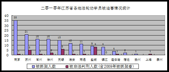 在被绑架、非法抄家的一百五十人次中,南京地区三十五人,苏州二十一人,徐州十六人次,常州十六人次,无锡十五人次,淮安十二人次,南通十一人,盐城九人,镇江八人,连云港四人,宿迁两人,扬州一人。在被非法判刑的二十七名法轮功学员中,盐城非法判刑八人,无锡六人,苏州五人,徐州二人,常州一人,南京一人,淮安一人,南通一人,连云港一人,上海一人。