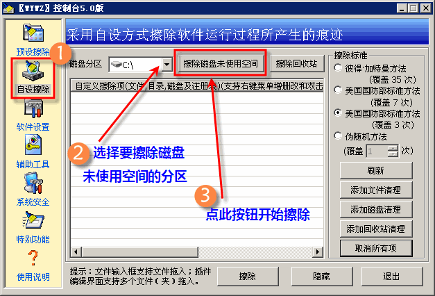 2、如果在使用无影无踪以前,曾经直接删除过私密文件(例如把私密文件放在公开分区了,之后直接删除掉了,没有使用无影无踪擦除这个文件),可以使用无影无踪的未用空间擦除功能擦除剩余磁盘空间,不是这种情况不必执行未用空间擦除。“无影无踪”擦除磁盘剩余空间的步骤(如下图):①打开“无影无踪”,点“自设擦除”;②“[磁盘分区]部份选择要擦除磁盘未使用空间的分区;③之后点击“擦除磁盘未使用空间”就可以擦除了。