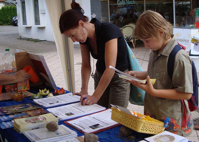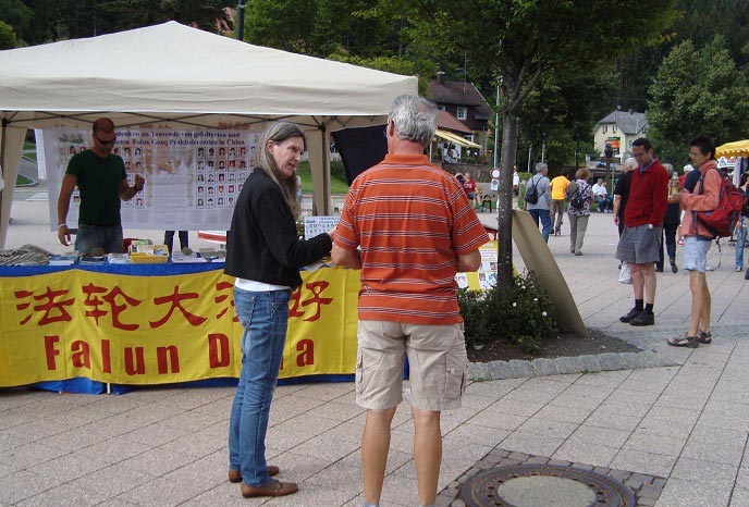 来自东德的女游客问:共产党为什么要迫害法轮功? 学员说,当时在中国大陆有将近一亿人在修炼法轮功,这大大超过中共党员的人数,中共对这么多人信仰“真、善、忍”感到恐慌。女游客说,自己出生在东德,后来到了西德一对比,看到了不一样的社会生活,才知道什么是正常人的生活,才体会到共产极权是什么货色。她赞赏法轮功学员在这里向人们揭露中共的共产极权黑幕,和平理性地反迫害。她还说,她能感觉到,现在中共在极力向其它国家,特别是东南亚各国渗透和施加影响,这令她不安。因为中共的国家恐怖主义是很可怕的。说完,这位女游客离开了。不一会儿她又走回来说,我忘了签名(反迫害),现在就签。