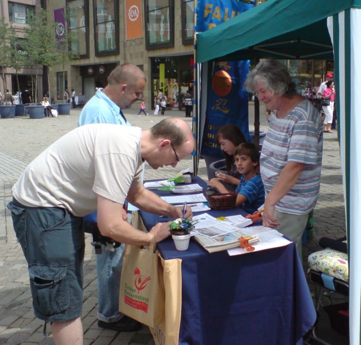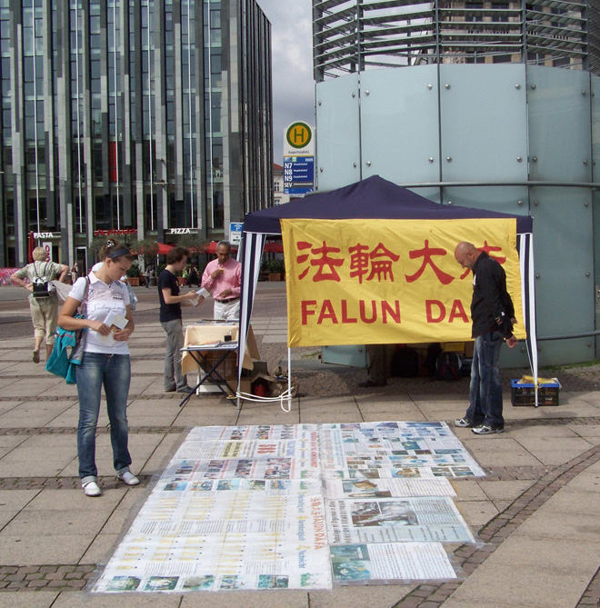 法轮大法在德国越来越广为人知,很多德国人一看到“FALUN DAFA”的字样,就会直接询问如何开始炼功,炼功点在哪里。有的更是迫不及待地在信息台旁跟学员学炼了起来。一个德国小伙子和女朋友经过一位发资料的学员身旁,他笑着说:“别给我资料了,我现在就在炼法轮功。”他还指着身边的女友说:“法轮功的情况我都跟她说了,她都清楚!”