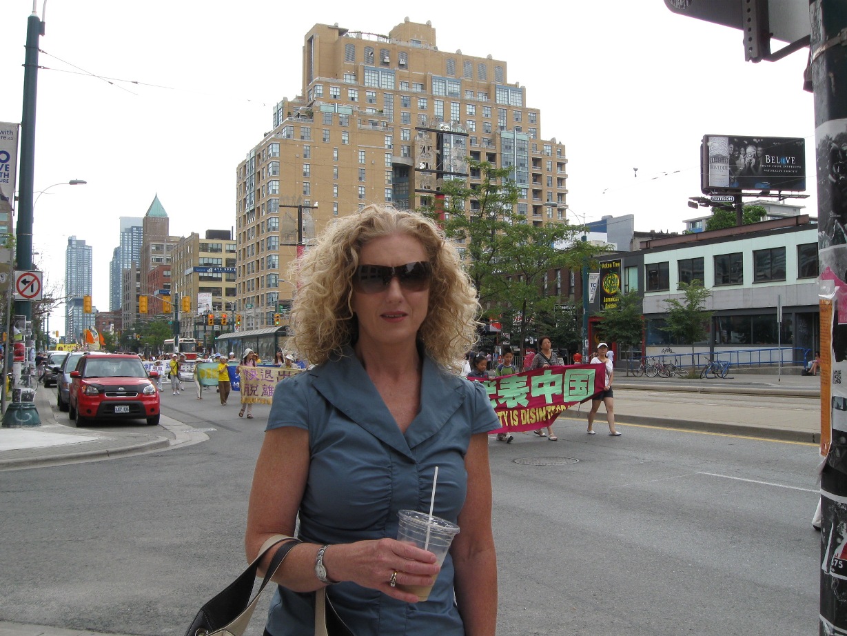 观众伊丽莎白(Elizabeth)在对着游行队伍拍照,她说:“这个游行很庞大,表达着这些中国人的呼声,这种呼声是应该得到重视的,象今天这种呼声在中国国内是不可能听到的。我作为一个加拿大人,我应该和全世界的人一起来帮助他们,让全世界的人都能听到他们的心声,并制止在中国的所有迫害。”