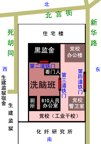 洗脑班院内北边有一排平房,是私自囚禁法轮功学员的“黑监舍”。窗户上有像关动物的铁笼子那样的铁栏。每个房间都用第一道铁栅栏门锁着,几个房间共用一个过道通向屋外,外面再用第二道铁栅栏门锁上。院墙上密布带刺的铁丝网,院门口有看门人看守,院门用红色的第三道铁板门锁着。再外面,设有“潍坊市工业管理干部中等专业学校”的第四道铁门和门卫。十年来,进出洗脑班的人、绑架法轮功学员的车辆,都通过“中共奎文区党校”的大门走,“中共奎文区党校”对洗脑班内发生的罪恶心知肚明。如果没有“中共奎文区党校”为“六一零”提供地盘盖监舍,很多发生在洗脑班里的罪恶就难以得逞。