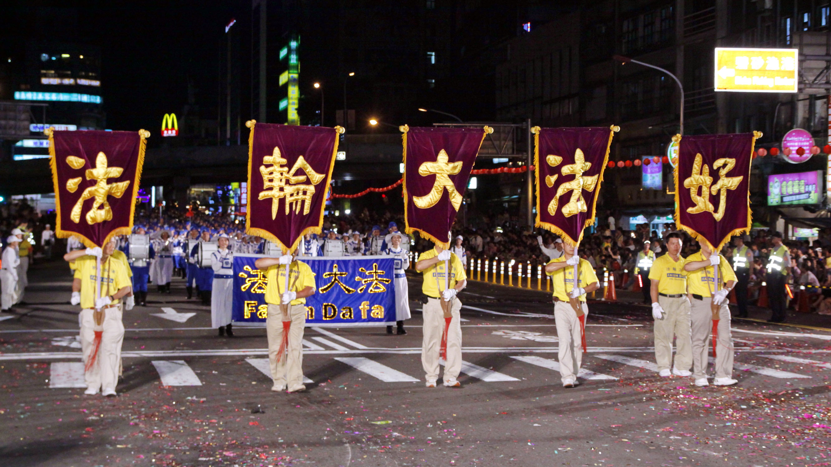 ![]() 基隆中元祭放水灯游行中的“法轮大法好”花车 |