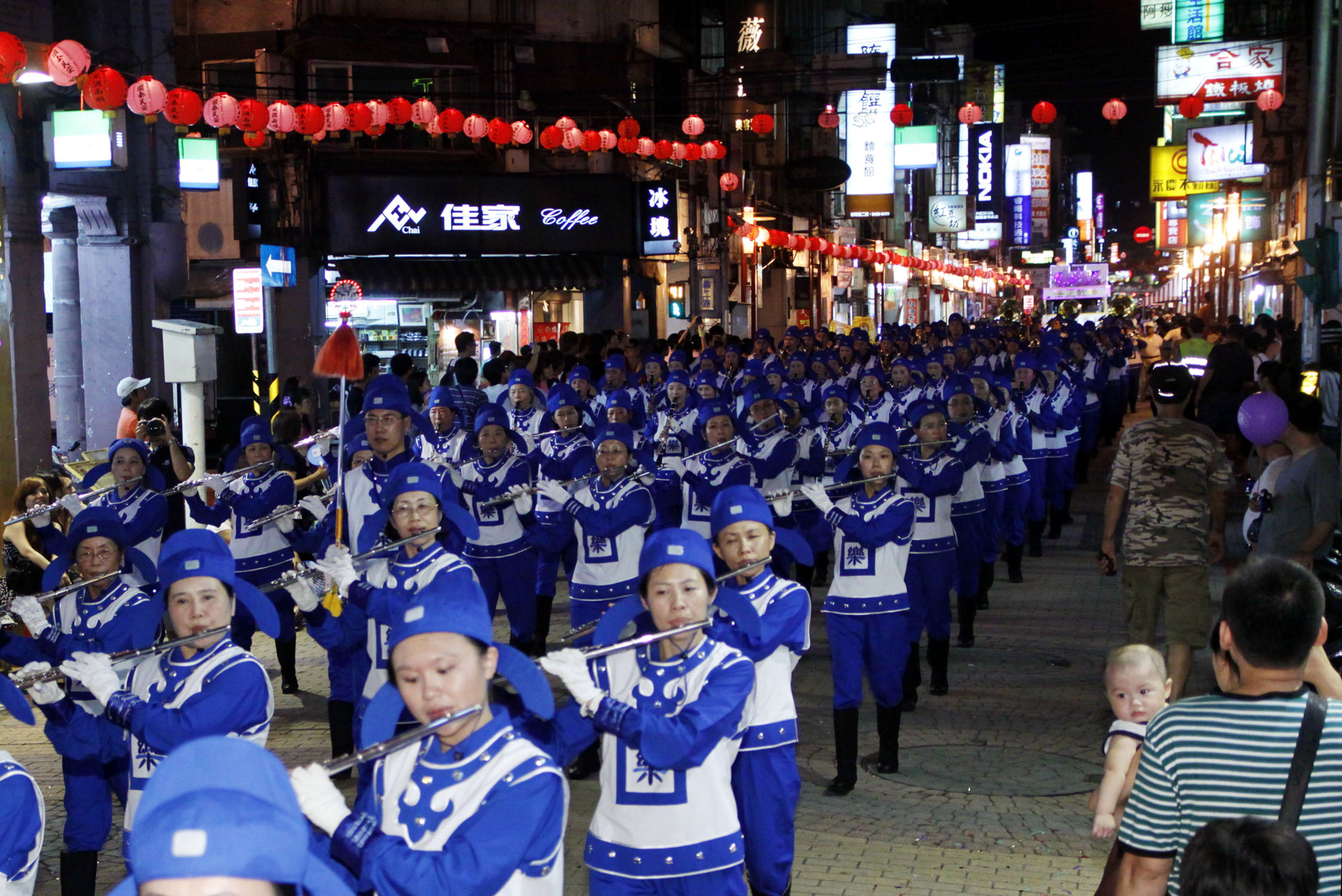 由二百多位台湾法轮功学员组成的天国乐团,今年是第五度参加鸡笼中元祭游行,雄壮的军乐演出震撼现场的民众。由十二位法轮功学员所妆扮的仙女队,沿途分发有“法轮大法好”书签的小莲花,民众争相领取。到了十点多,三十六个团体游行结束,街道两旁的民众与游客意犹未尽地离去。