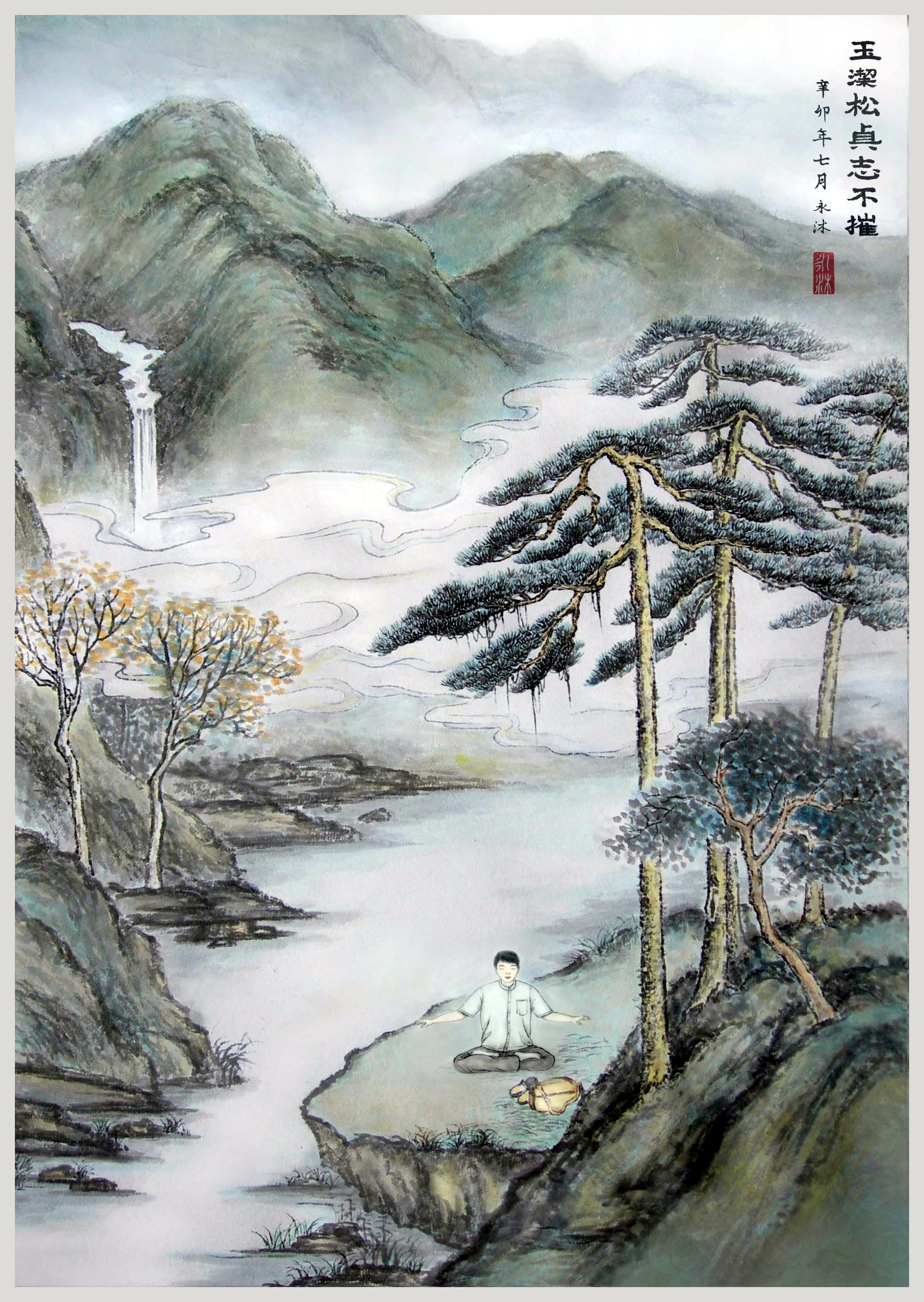 【明慧网二零一一年八月二十一日】在中共邪党打压法轮功的严酷环境下,大陆大法弟子坚持真理,走遍千山万水,向被蒙蔽的世人讲述真相。下面的绘画是一位大法弟子炼功的情景。
