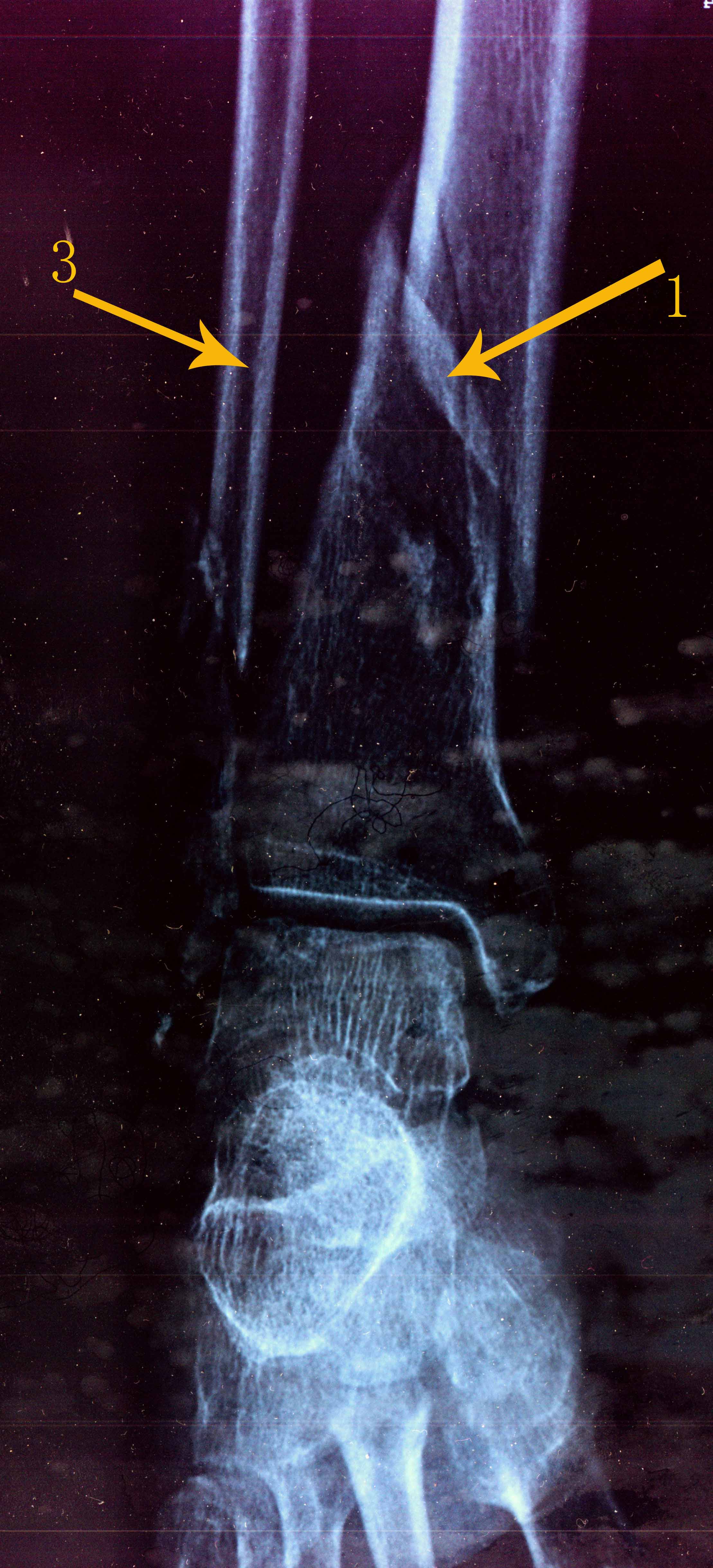 ![]() 为左小腿撞伤处的X光片子,其中箭头1为胫骨断裂处,箭头3为腓骨错位到内侧。 |