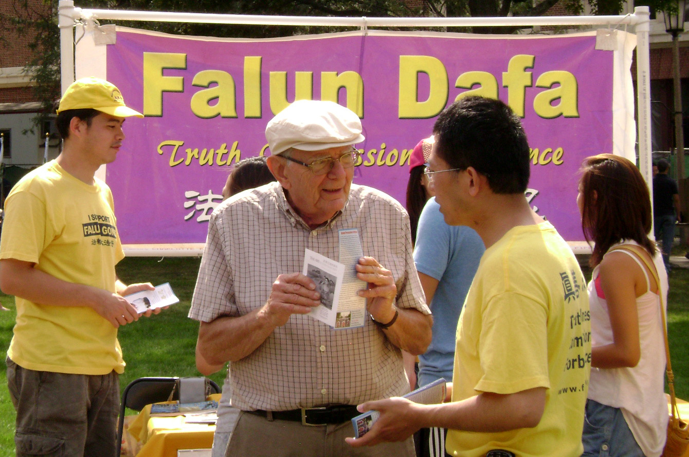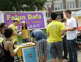 一位刚从大陆出来不久的同学,起初对法轮功有很多疑问。学员就给他解答,后来他紧皱的眉头逐渐展开,渐渐露出笑脸。后来他感激地跟学员握手,高兴地离去。