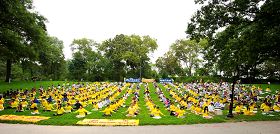 二零一一年八月二十七日清晨, 纽约中央公园的草坪上,数百名来自世界各地的法轮功学员专注的炼功,场面祥和。