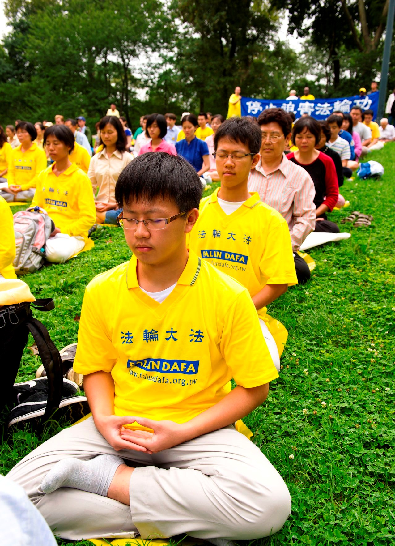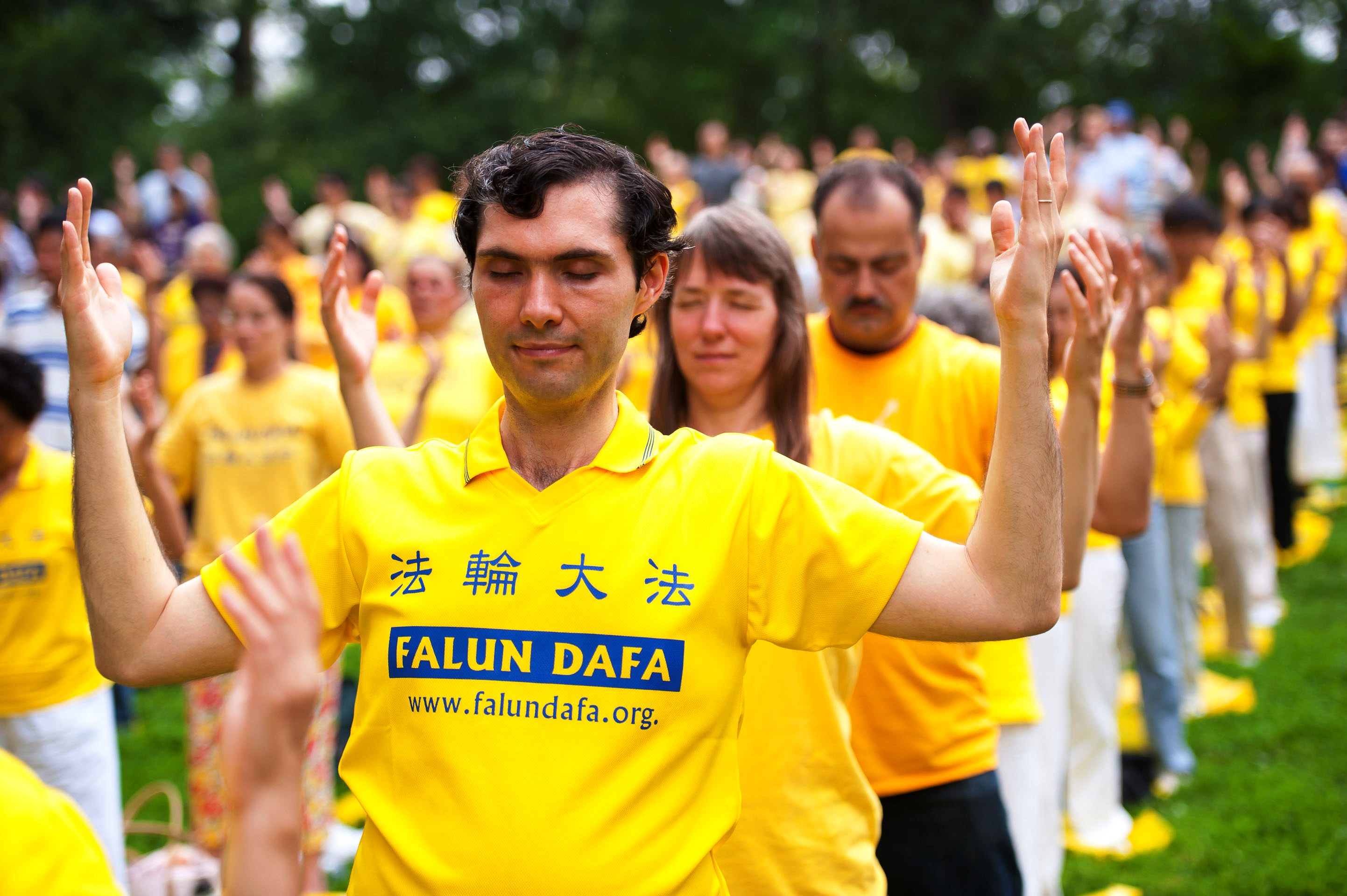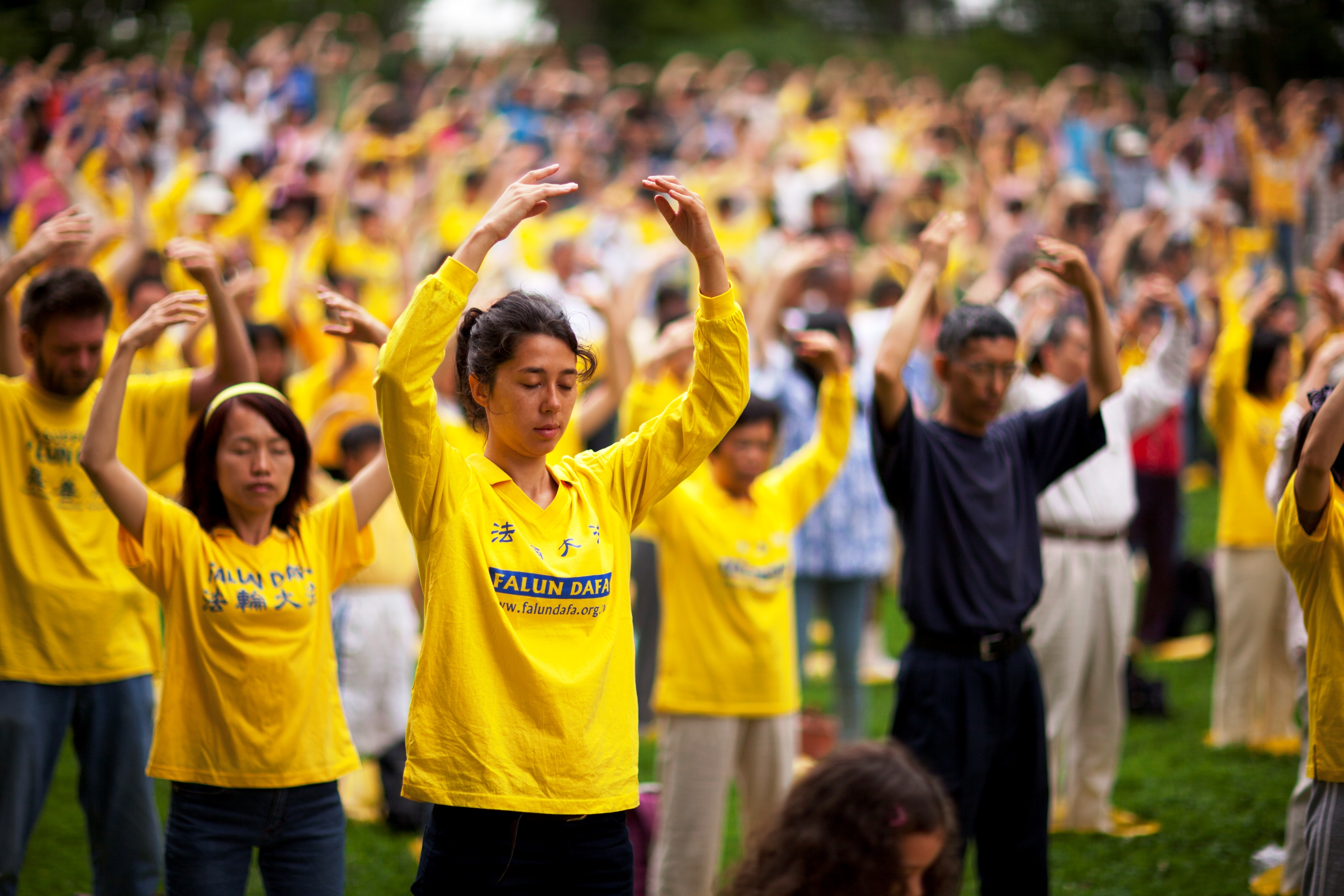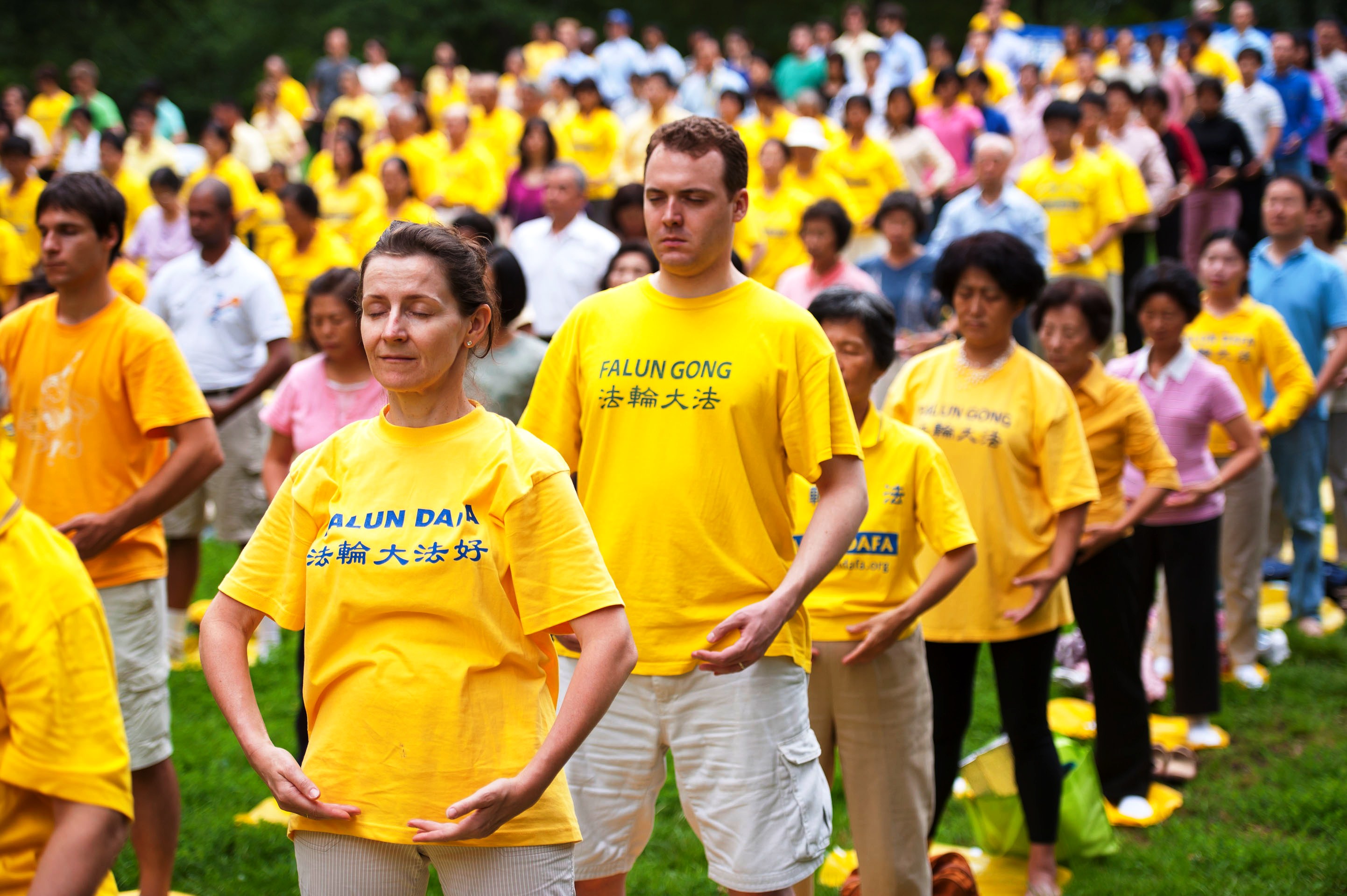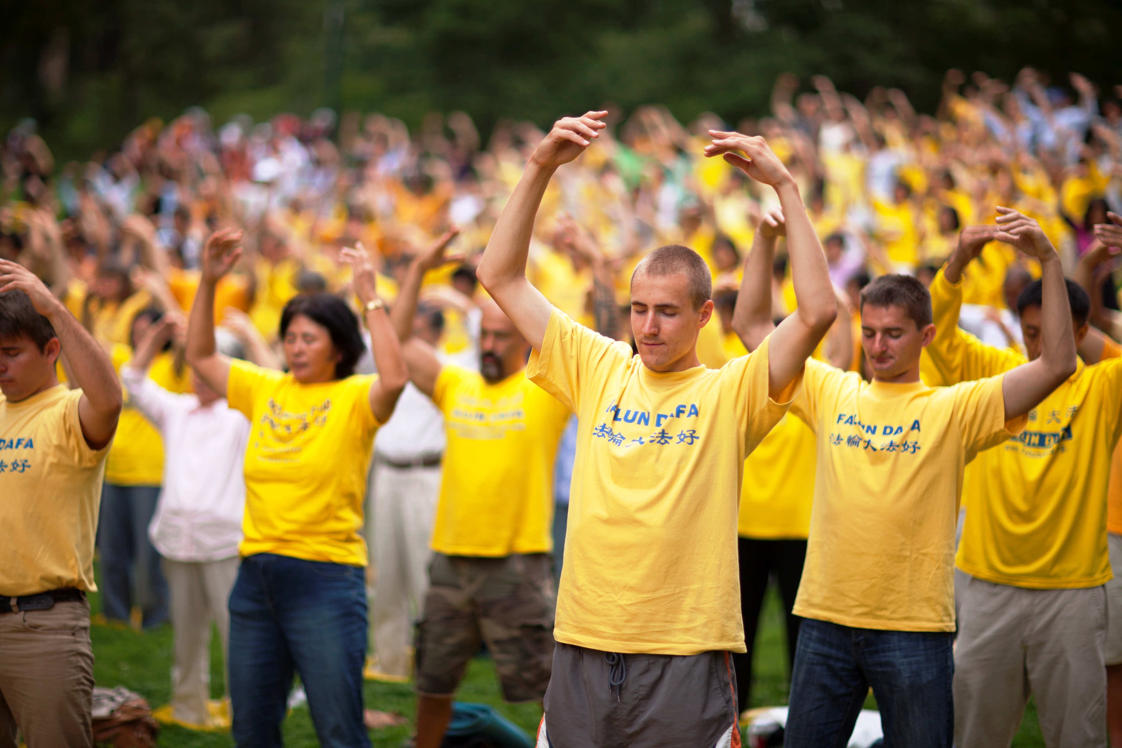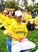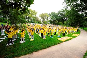 碧绿的草坪上,数百人随着炼功音乐,整齐的展示着法轮功五套功法。每个人都是那样的投入,那样的幸福。炼功人中,有头发花白的耆老, 有活泼可爱的孩童,有妙龄的少女,有青年的男子,有沉稳庄重的中年人,也有初涉人世的少年。年龄跨越了三四岁的孩童到七八十的老者。这里有黄种人,白种人,黑种人,各种肤色,各个民族。
