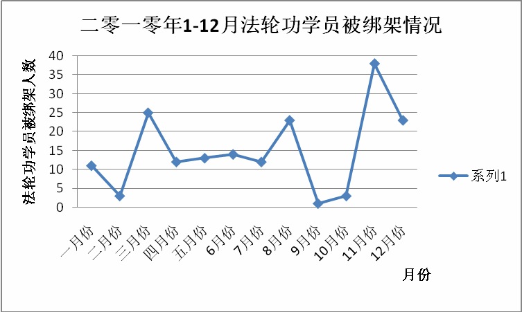 从二零一零年唐山被绑架法轮功学员情况统计图明显看出,三月份、七月份、十一月份,都是全年法轮功学员被绑架的高峰,而恰恰都是“六一零”头目许德茂部署所邪恶的“严打会战”中。(见表二及图二)
