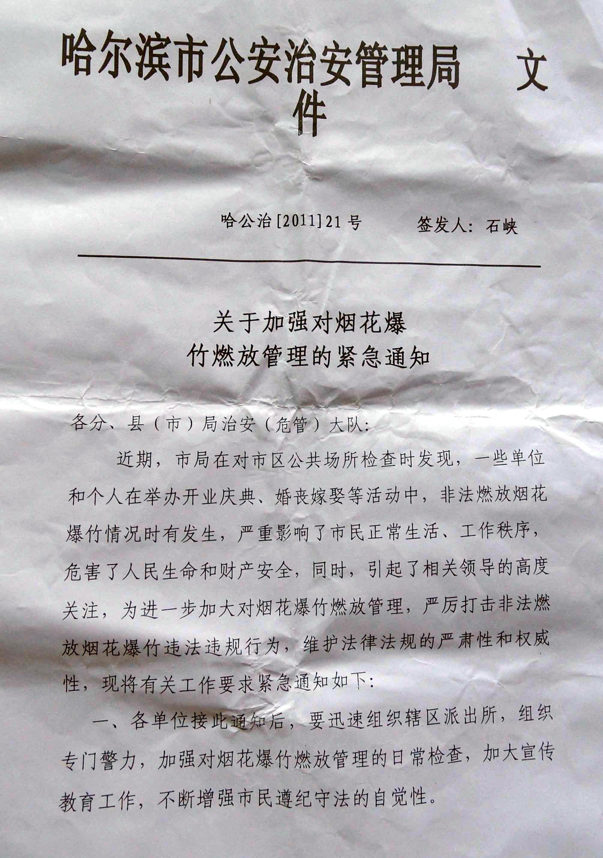 当被问到:燃放鞭炮违反了哪条法律?观看放鞭炮又违反了什么法律?你们凭什么抓人?王正军等人理屈词穷,为了开脱自己随意抓人的罪名,在派出所内现场打印了一份“哈尔滨市公安治安管理局文件”。