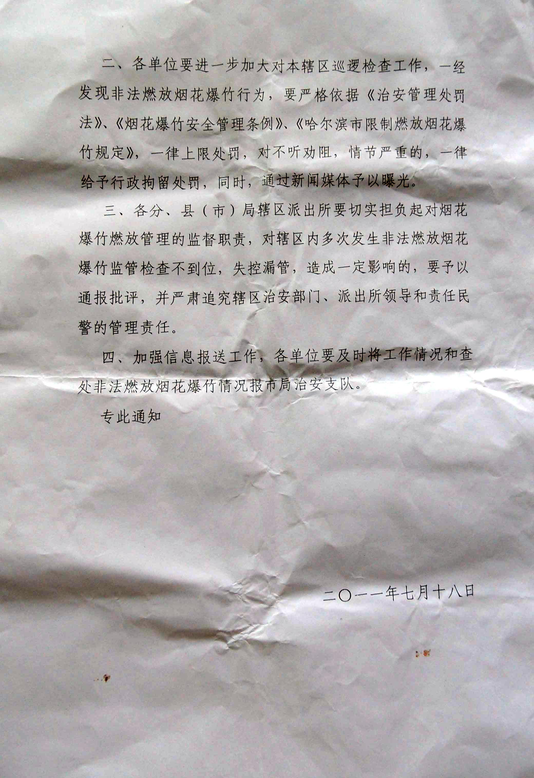 在打印的所谓“紧急通知”中,“文件”两个字被粗糙的排版成两排,签发日期是七月十八日。如果这份所谓的“紧急通知”是哈尔滨市公安治安管理局签发的,这表明中共当局因惧怕民众放鞭炮欢庆江××脑死亡,匆匆炮制了这个紧急通知,企图阻止民众放鞭炮。