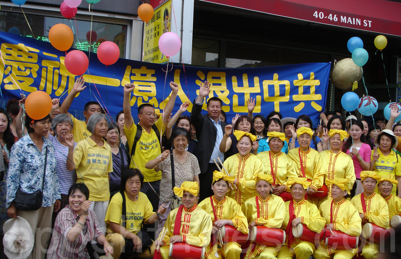 八月七日下午四时,全球退党服务中心总部办公室所在地——纽约法拉盛缅街上,锣鼓喧天,百余位退党中心的工作人员手举写有“庆祝一亿人退出中共”的灯笼、气球和横幅,身穿黄色服装的腰鼓队成员载歌载舞,吸引了许多民众驻足围观。有的民众一边赞叹:“啊,退党(‘三退’:退出中共邪党、团、队)人数已经一亿!”一边用手机拍下这珍贵的历史镜头。
