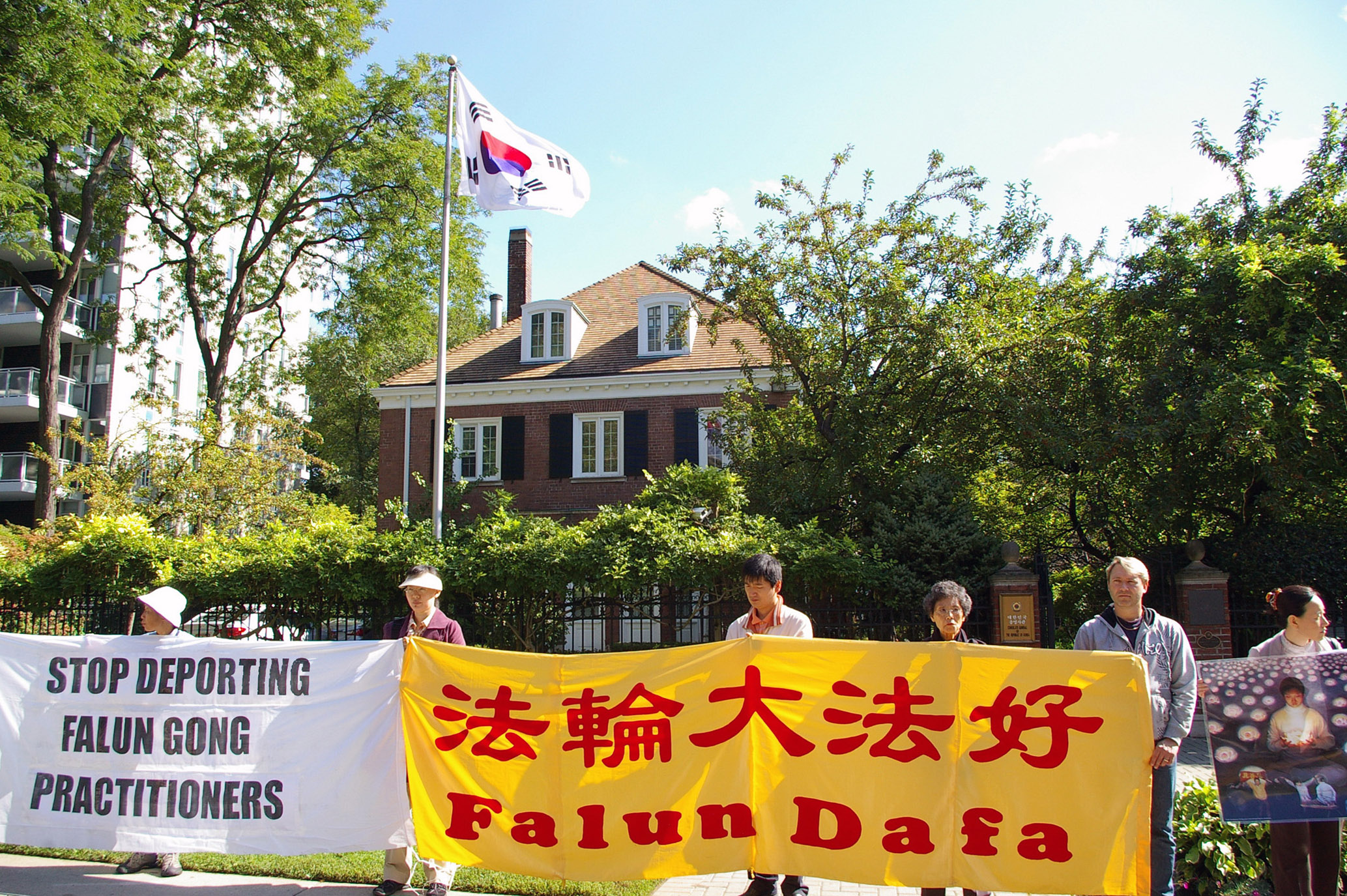 法轮功学员在韩国驻多伦多领事馆前集会,呼吁李明博政府不要屈从中共压力,停止遣返在韩国的大陆法轮功学员。