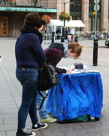 二零一一年九月二十四日星期六,芬兰法轮功学员在火车站开始了每周六固定的讲真相活动。