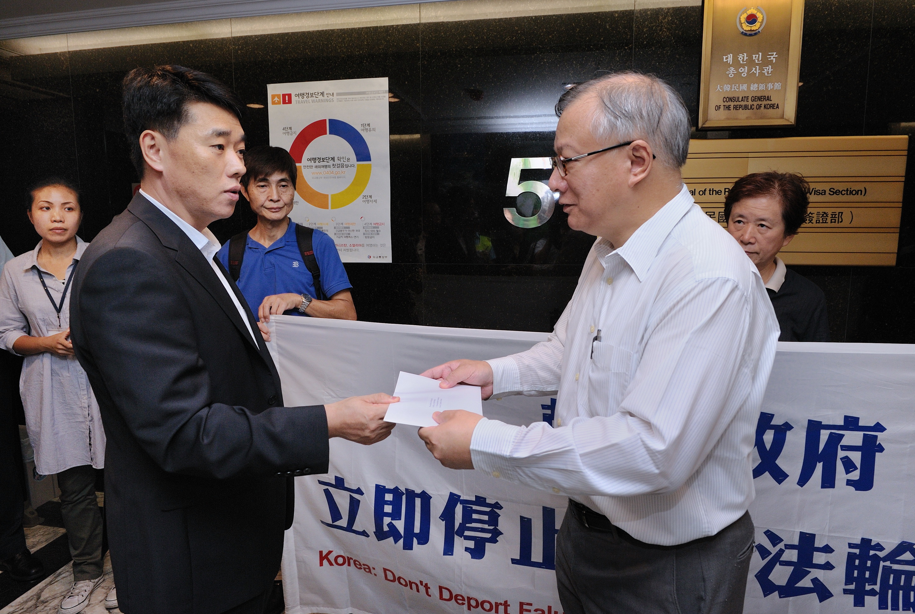 南韩领事馆领事朴光柱(前左)接收香港法轮功学员致南韩总统李明博的声明信函。