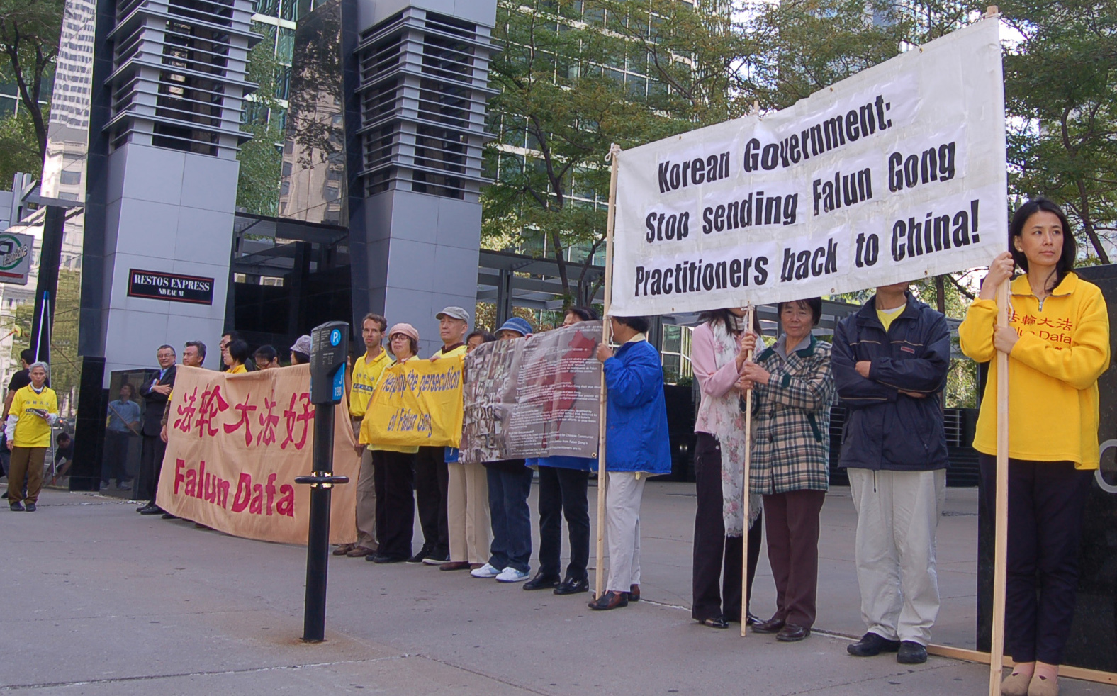 加拿大蒙特利尔法轮功学员在韩国领事馆前抗议韩国政府打算遣返中国法轮功学员,置他们于中共的迫害之中。