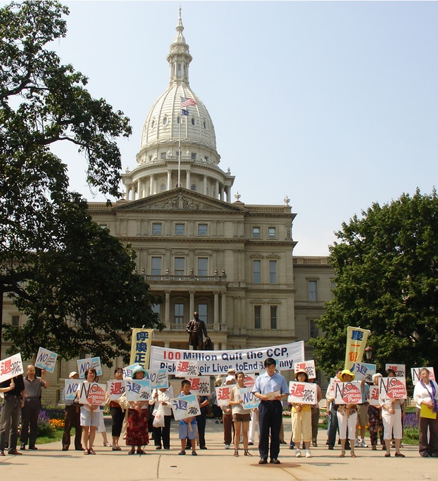【明慧网二零一一年九月六日】(明慧记者徐菁密西根州报道)二零一一年九月三日,美国密西根州首府兰辛市(Lansing)的州议会大厦前,大底特律地区来自多个团体的各界华裔民众,在这里举行了庆祝一亿中国人退出中国共产党、共青团和少先队(简称“三退”)的集会。