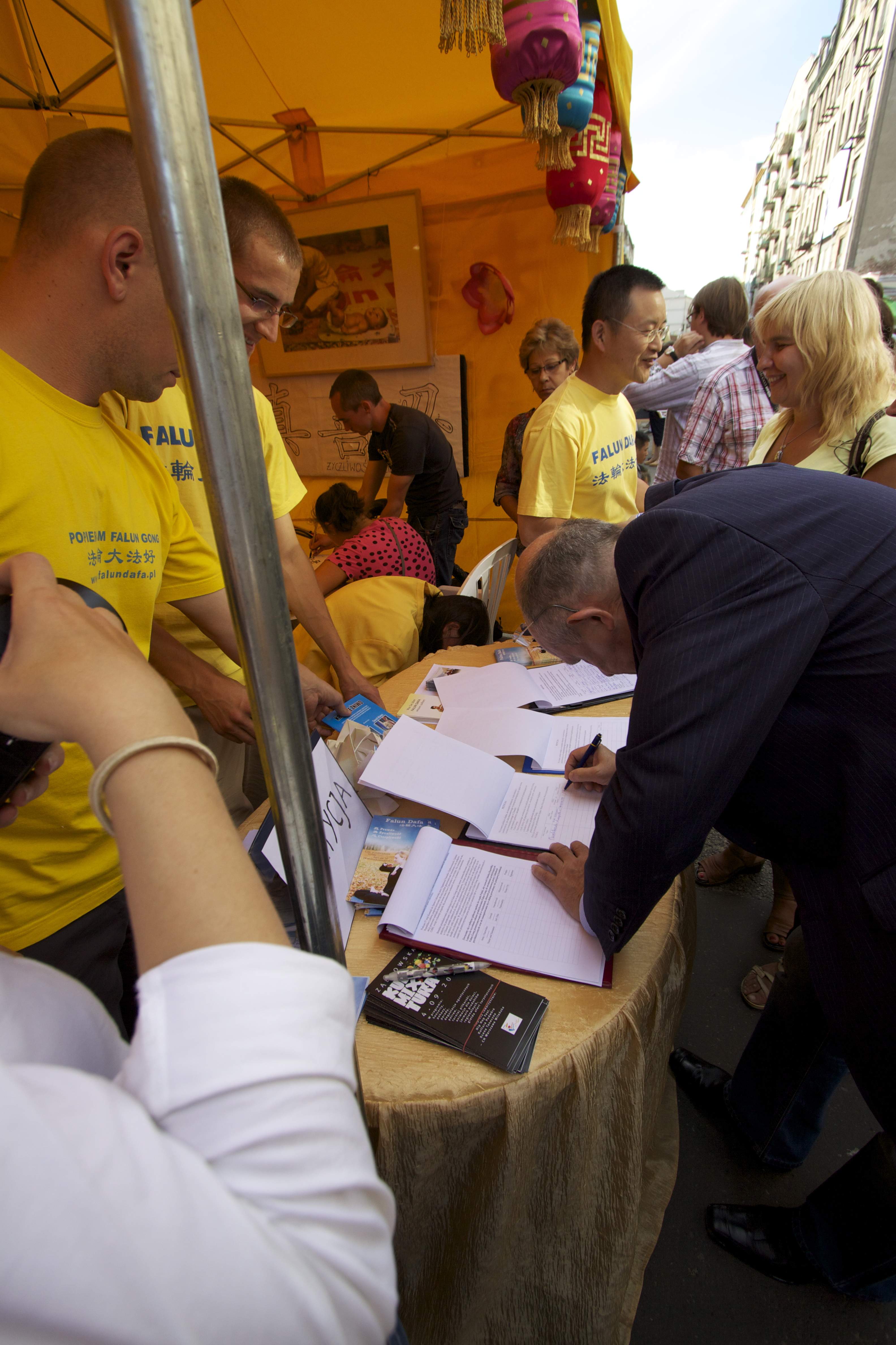 波兰议员马莱克•博罗夫斯基(Marek Borowski)曾任波兰议会议长,也来到征签台前,他仔细阅读征签簿上的说明后,签下自己的名字,支持法轮功学员反对中共迫害。走前,他拿取了各种法轮功真相资料,特别是《血腥的器官摘取》报告,并拿走一朵象征出淤泥而不染的纸莲花。