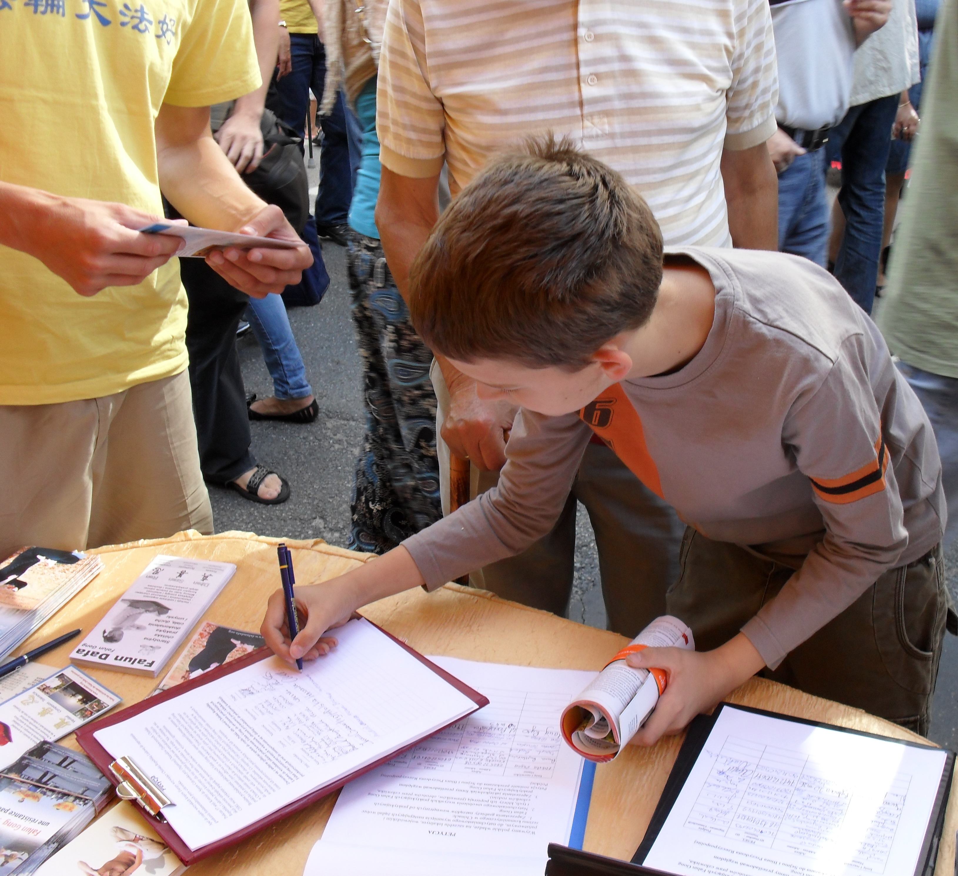 一位约十岁左右的孩子来到征签台前问:我可不可以签名?我反对(共产党的)迫害,我要支持法轮功。