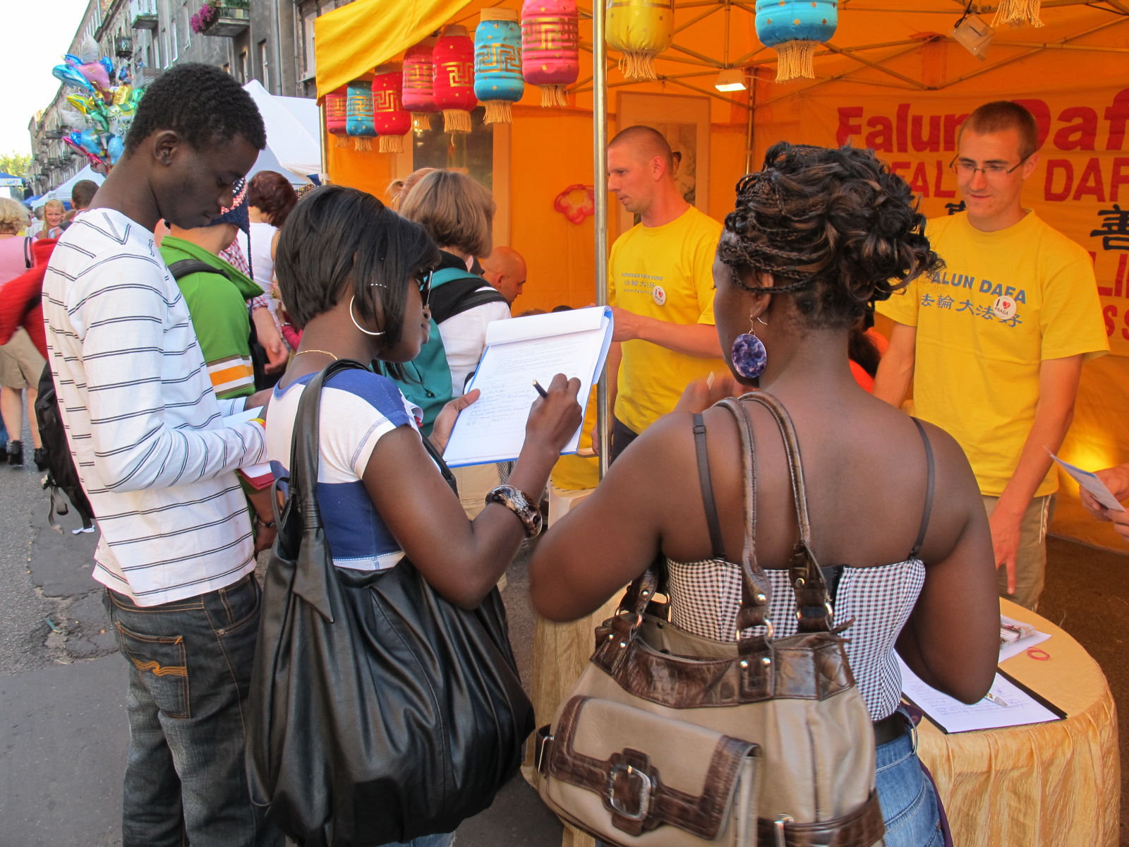 越来越多了解真相的波兰人来到征签台,排队签名,表达他们对中共邪恶行为的愤慨和反对。一位姑娘看到大陆法轮功学员遭受的残酷迫害照片,无法忍受中共的滔天罪行,站在展板前失声痛哭。很多人都在询问,“我还能做什么帮助你们?”