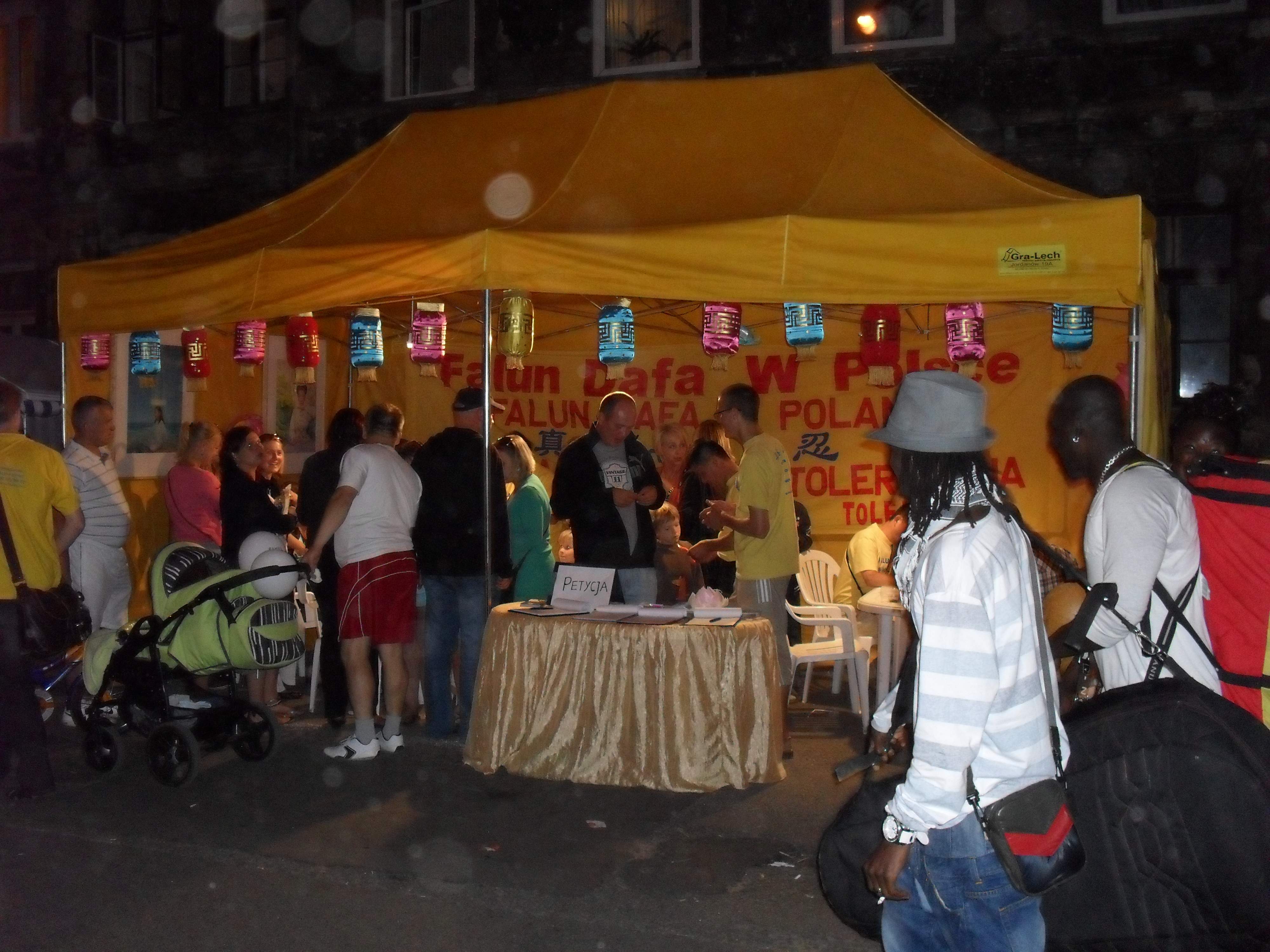 上午八点,各参展团体在布拉格区的布雷斯特(Brzska)街上开始忙碌的布展,只见唯一一座黄色帐篷醒目的矗立在街区的中间地段。帐篷内正面悬挂“法轮大法在波兰”大字横幅,帐篷外也远远可见“法轮大法”的字样;法轮功真相展板立在帐篷一侧,可供双向人流观看;三张桌台上分别放置制作纸莲花的五彩纸;学写中国字的毛笔字帖和“文房四宝”,靠近街道的桌上放满各种语言的法轮功真相传单、中、波语《九评共产党》、波兰语《血腥的器官摘取》报告及多本谴责中共迫害法轮功的征签簿。