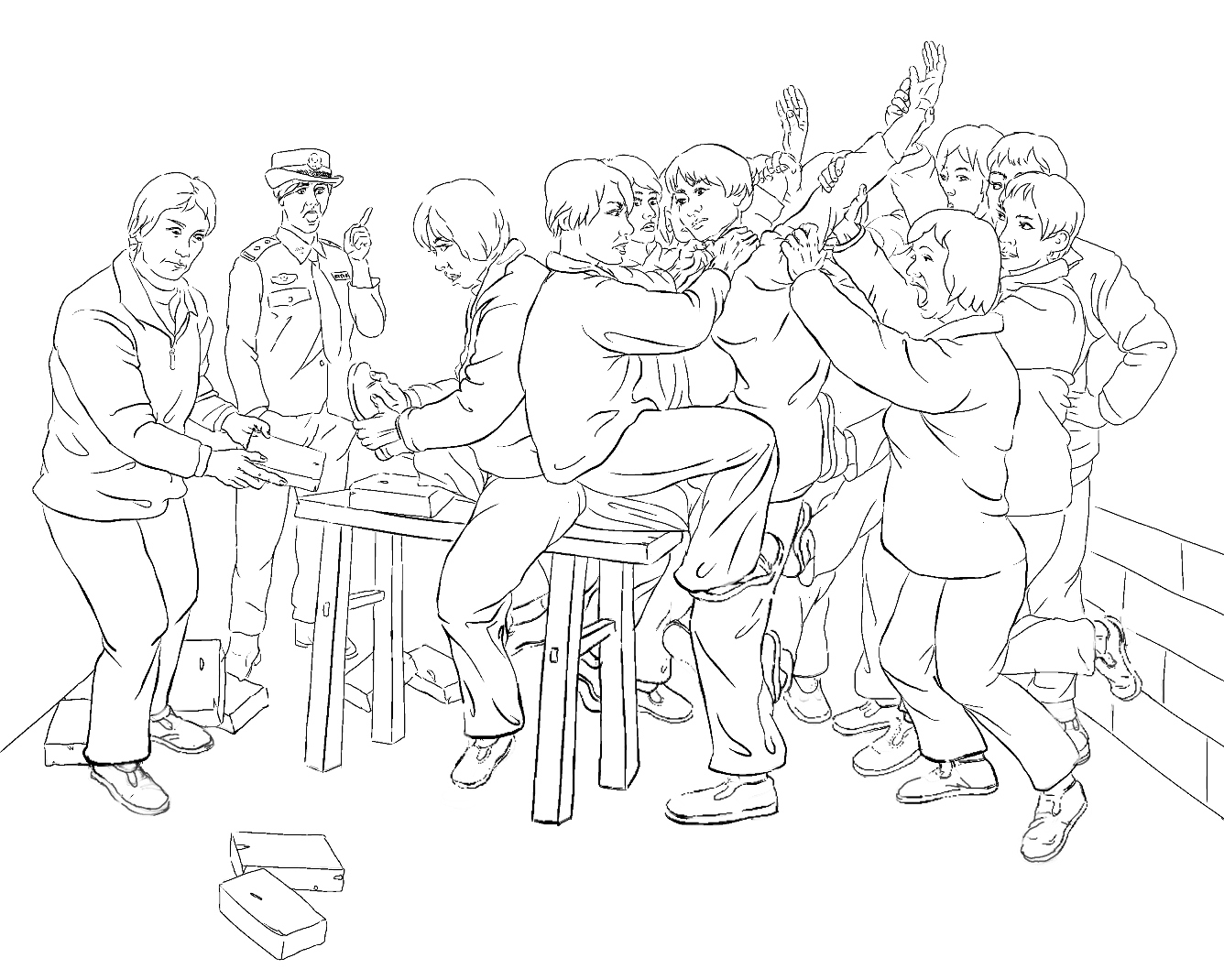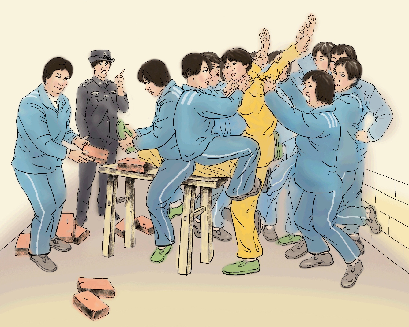 我还亲眼见到一位法轮功学员被这六组二十四人轮流拖跑后,恶警命令把这位法轮功学员一只脚站立、另一只腿抬起的放在齐腰高的凳上,放在凳上的这只腿上,大、小腿上各坐一个毒贩,坐在大腿上的毒贩双手卡着法轮功学员的脖子,而坐在小腿上的毒贩用双手卡住放在凳上这只脚的脚踝。法轮功学员站立的这只腿,前四人、后四人共八人,此八人一只手叉腰,另一只手用力抵着法轮功学员的肩、背、胸、腰,使身体不能动,此八人每人一腿站立,另一只脚蹬在法轮功学员站立的腿的前后方,使站立的腿不能动,整个身体就如同上了夹板一样;另左右八人,将法轮功学员的两只胳膊反推向后背,再推到头上直立,剩下的六人抬腿加砖,将坐着两个毒贩的那只腿不断的上升。大家想想:如果这个修炼人没有很强的正念和坚韧不拔的毅力,那人的腿和胳膊不就毁了吗!可她坚强地走过来了!