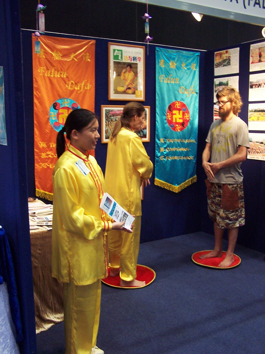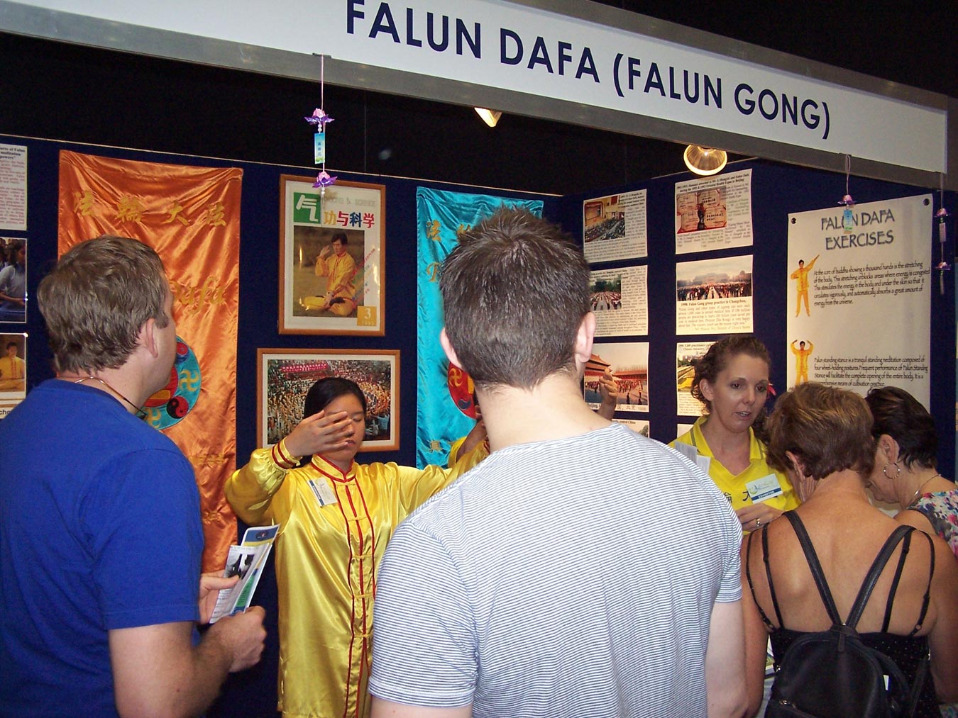 法轮功的展位上陈列着法轮大法弘传世界的图片和资料,身穿金黄色炼功服的学员们,在祥和的音乐声中向民众展示法轮功五套功法。来往的参观者频频赞叹:“好光明”,“好美”,“好闪耀”。