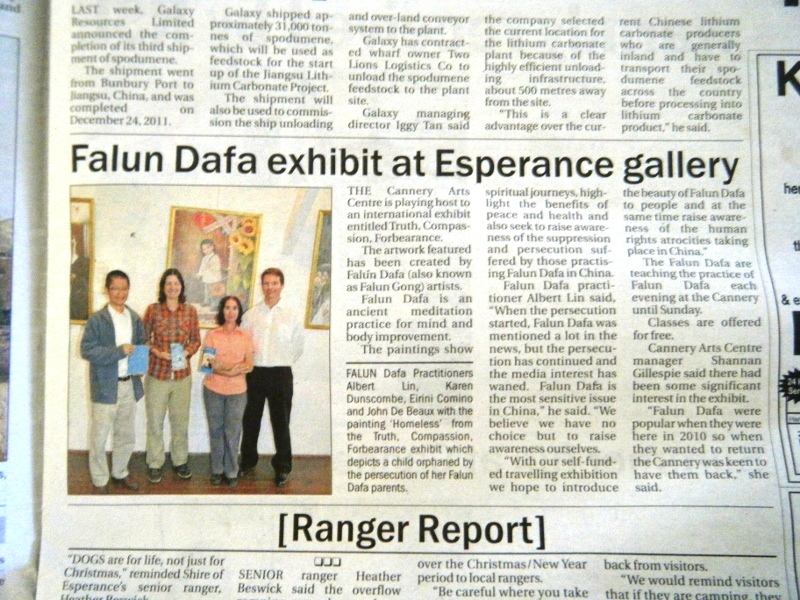 在埃斯佩朗斯镇,当地的最大报“埃斯佩朗斯快递报”(Esperance Express)在报纸上介绍了真善忍国际美展的精神,什么是法轮功,以及中国法轮功学员们无辜遭受中共迫害的情况。