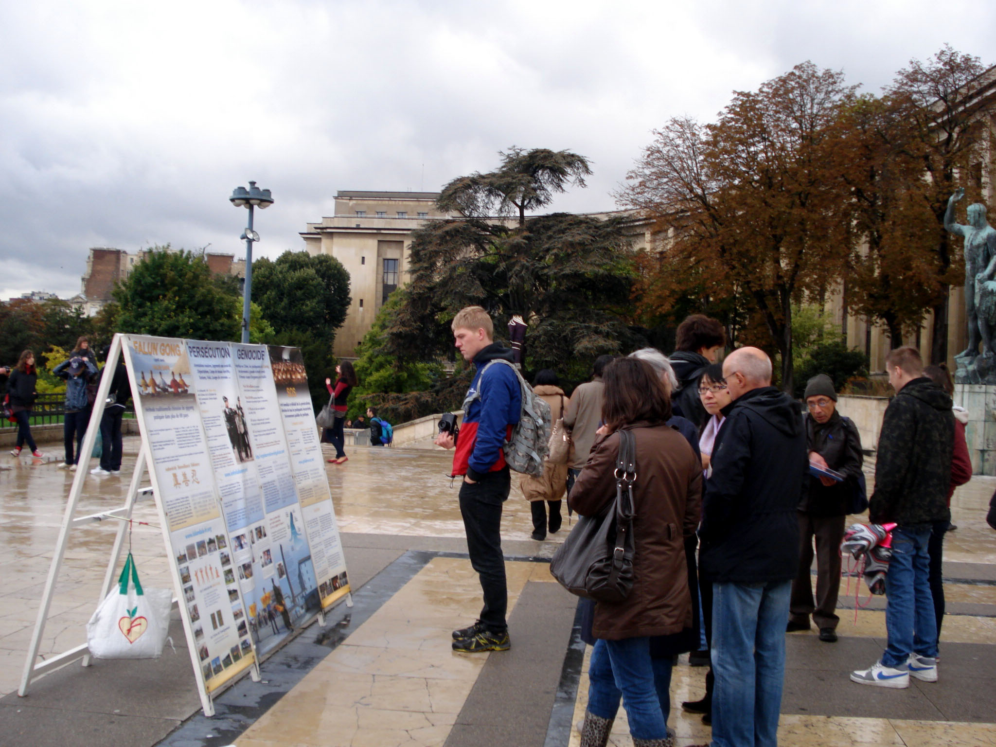 法国法轮功学员在巴黎人权广场举办活动,征集签名,促调查中共活体摘取法轮功学员器官的罪行。