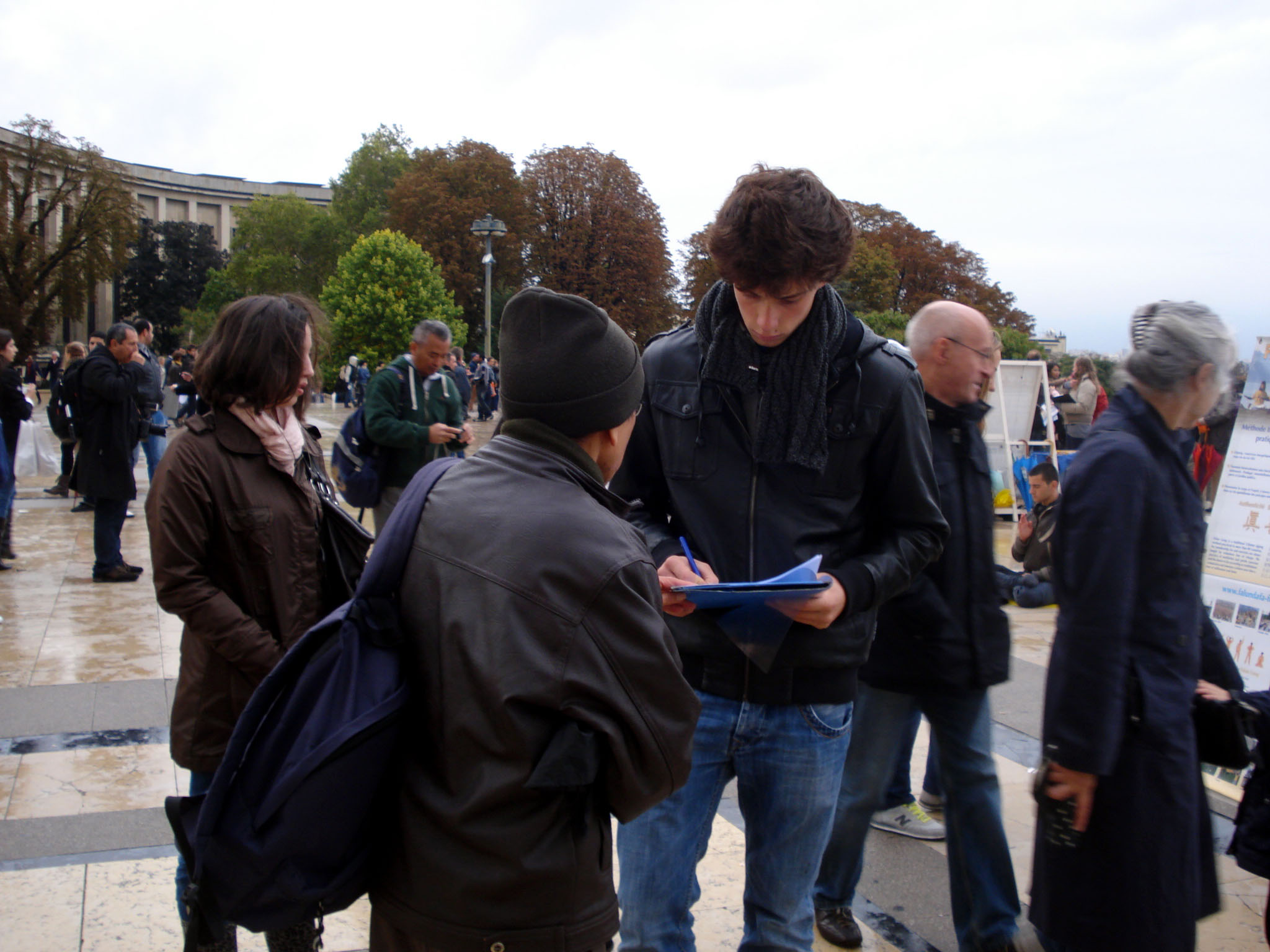 【明慧网二零一二年十月十九日】二零一二年十月十四日,法轮功学员在法国巴黎人权广场集会,征集签名,呼吁各界共同敦促联合国派遣代表团去中国大陆,独立调查中共活体摘取法轮功学员器官的罪行,尽快终止这一人类历史上最残忍的兽行。