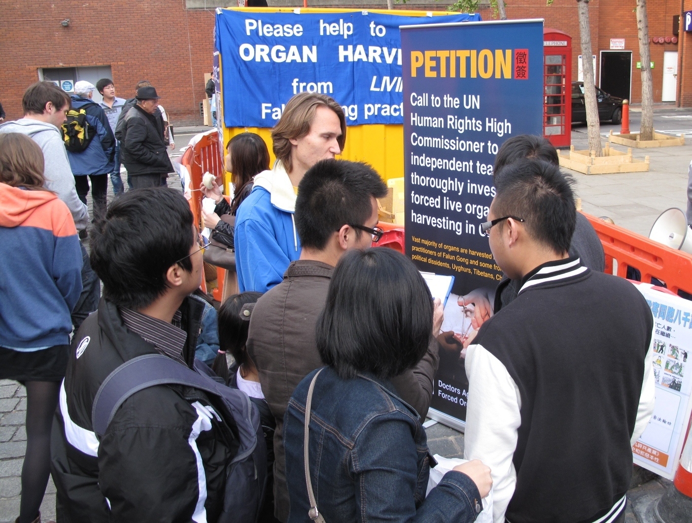![]() 法轮功学员在伦敦唐人街举办劝三退、反活摘器官征签活动,吸引许多中、西方民众驻足了解真相。 |