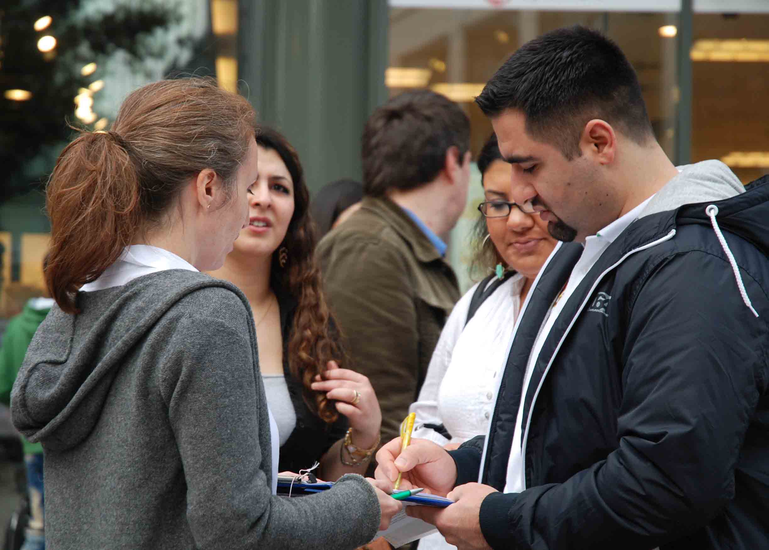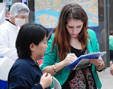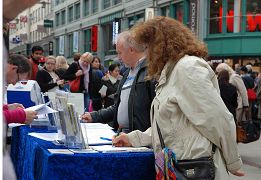 一位四十开外,高高瘦瘦,灰棕头发,身找米色长风衣的先生在边上观看模拟手术台很久。他听着广播里“(中共)总后勤部利用军队系统和国家资源,将法轮功学员验血编号,输入电脑系统……,统一关押,统一管理,成为国家级的活体器官库。” 不由皱起眉头。接过一张递上的传单,他马上读起来,整张读完后他抬起头,一动不动站立着,手里紧紧捏着传单。过了许久,他走向一个征签的学员,说,“我支持你们的呼吁”。表格的“职业”一栏里写着“医生”。