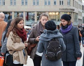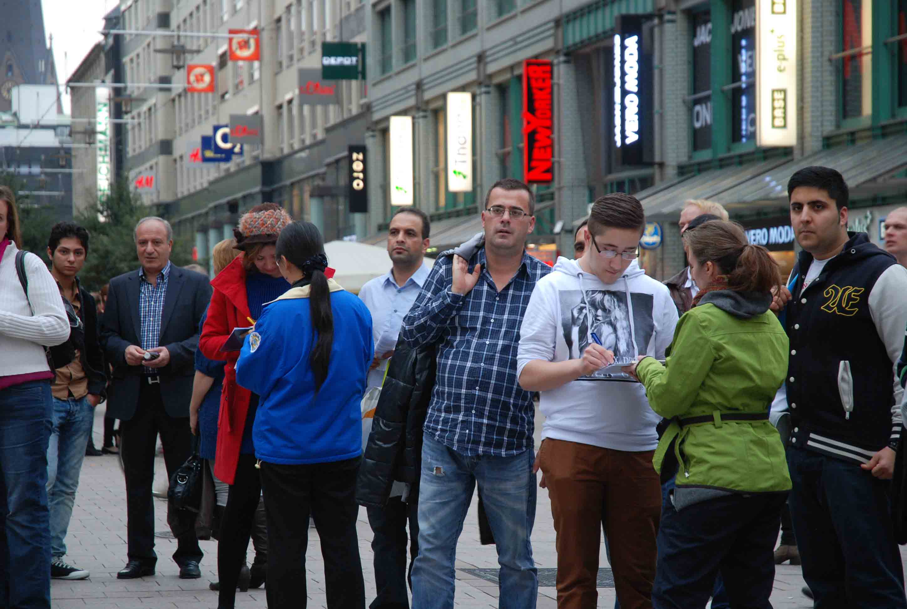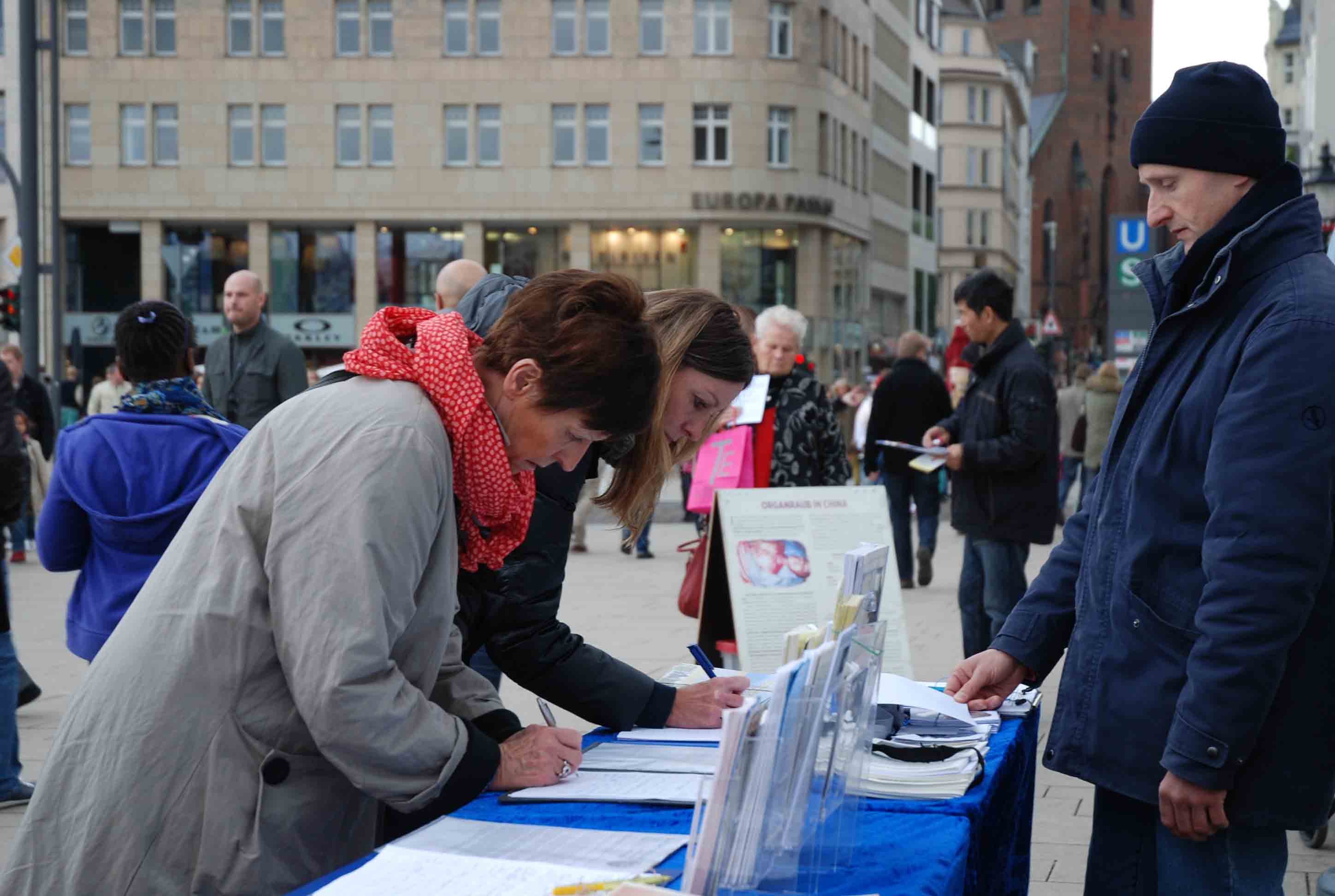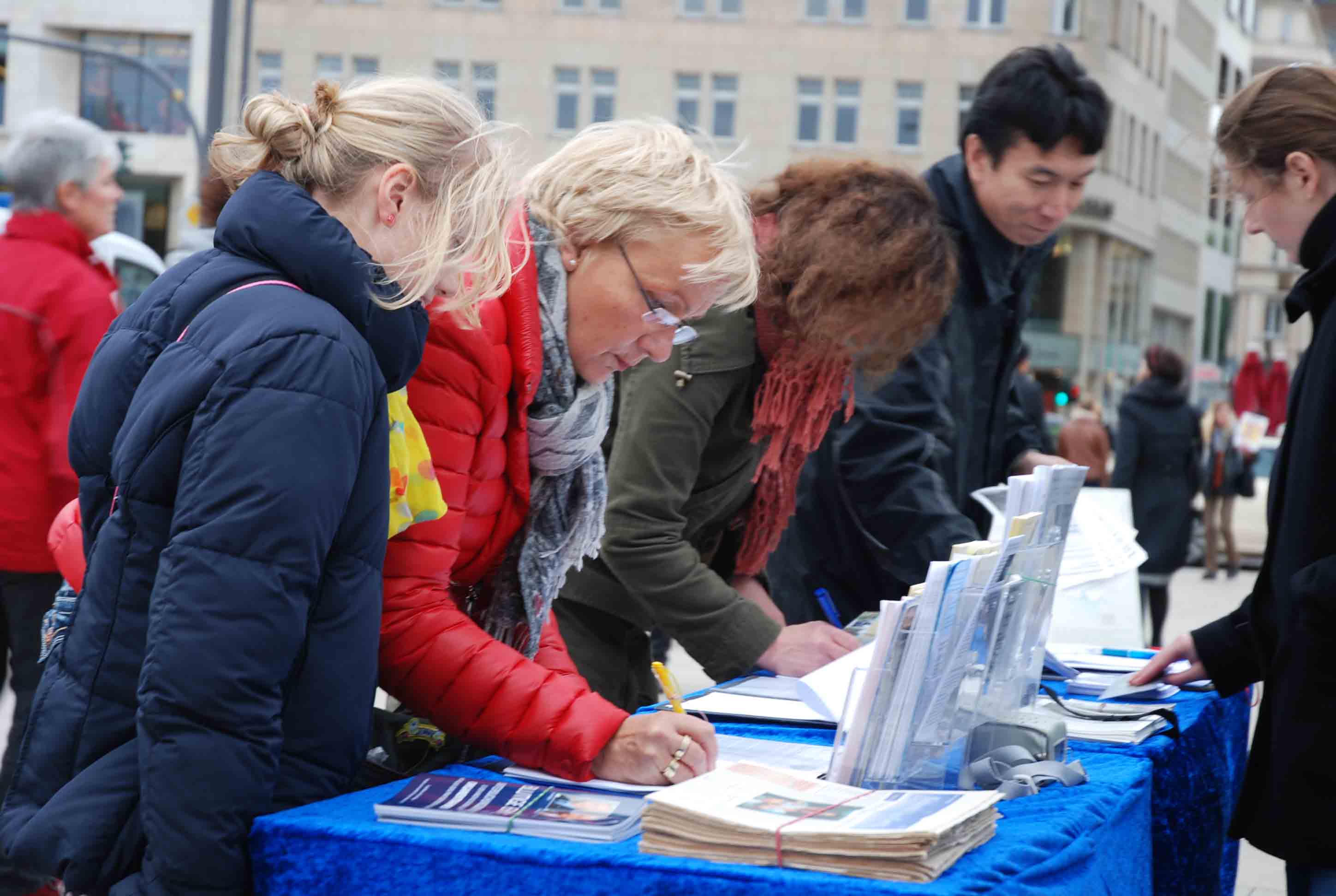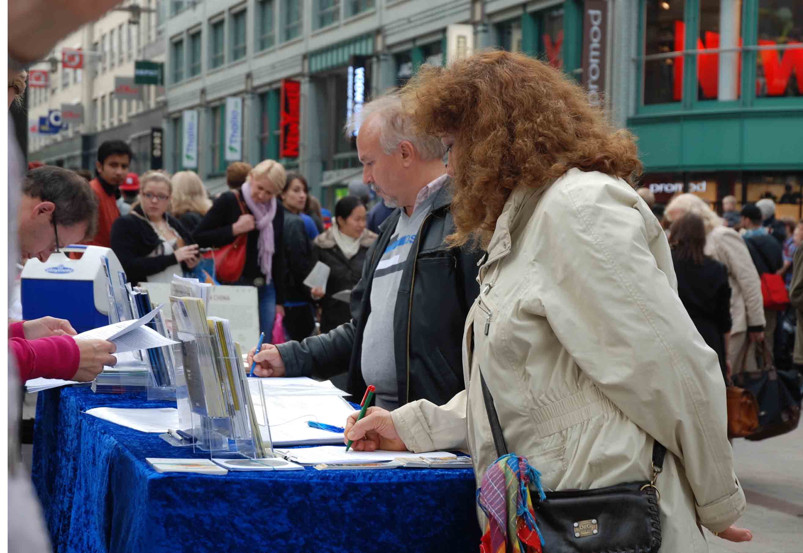 十月二十日的周六天气出奇的好,整个汉堡市中心的大小街道和步行街被游客、市民、街头艺人和各种信息展位填的满满当当。法轮功学员设在Spitalerstrasse上的征签桌和模拟手术台前驻足聆听和签字的路人接连不断,一群签了一群又来。
