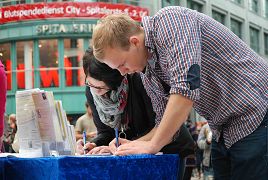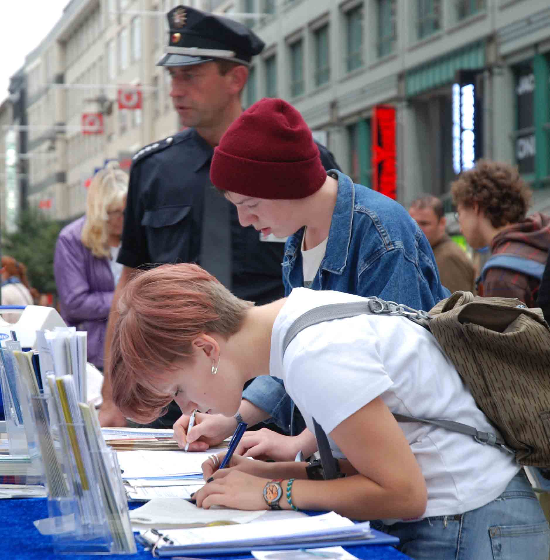 两个二十出头,在德国长大的外裔小伙子在“手术台”前愣住了。他们听到广播里“中共利用政府、军队、医院的体制,大面积的、而不是个别的,从被监禁的、活着的中国法轮功学员身上摘取器官。”惊诧不已。向学员进一步了解了中共对法轮功学员大面积的活摘器官的事实后说,“我们完全支持你们征签向欧盟呼吁”。