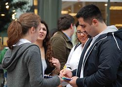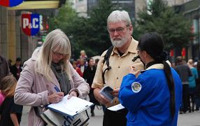 一位三、四十岁的公司执行总裁穿着一身考究的休闲装,和三位朋友经过展桌前停住了。他向学员询问究竟后马上签了字。在他的鼓励下,三位同伴也都签了名。其中一位年轻的栗色卷发女子边签边对法轮功学员说:“你们在这里做这个事,真是太好了。”