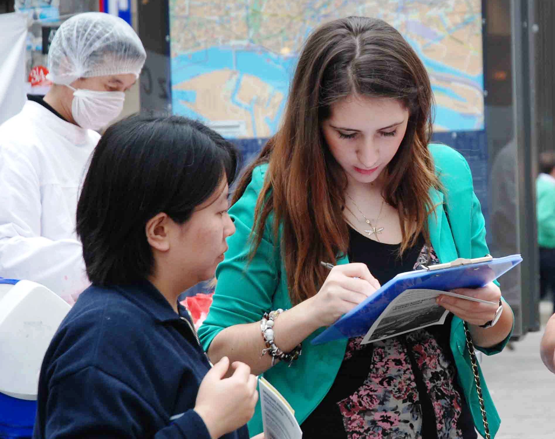 还有两个中国女孩儿问了许多问题。她们听说过法轮功被迫害的事情,可是从来不知道法轮功学员被活摘器官。她们问:“我们也可以签名吗?”
