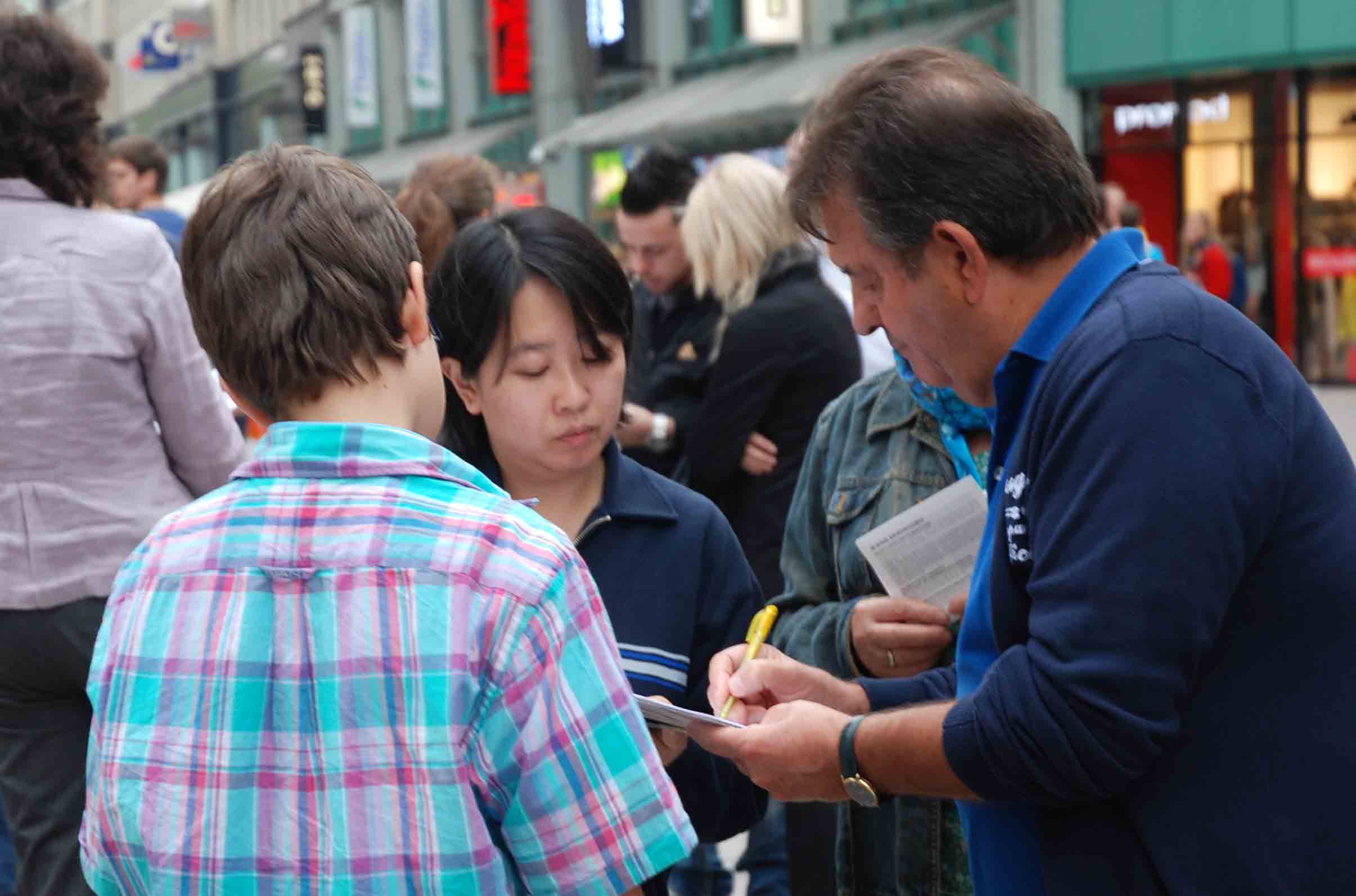 一位五十上下的先生两鬓已经灰白。他远远的看着“手术台”前穿着白大褂的“医生”慢慢划开“病人”的胸膛瞠目结舌,不知所措。当被问到他愿不愿意签字向欧盟呼吁共同抵制中共罪行时,他说:“我签,我必须签!我从未听说过有这样惨绝人寰的事,我非常愤怒!”签完字后他一再向法轮功学员表示感谢,又拿了一些真相材料才走。