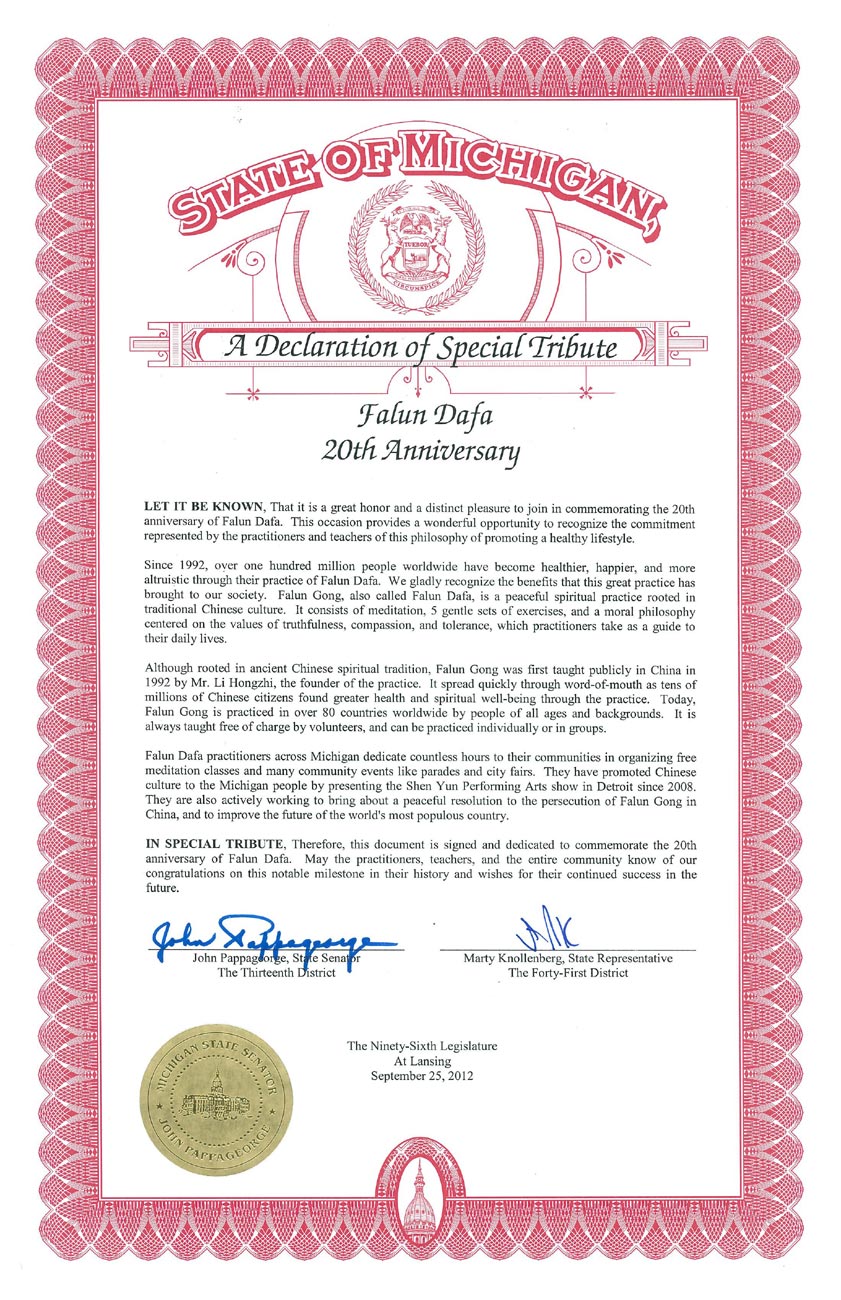 全密歇根的法轮大法修炼者为组织免费教功,参与社区活动如游行付出了无数的时间和精力。同时他们自从二零零八年开始通过神韵演出弘扬中国的传统文化。他们也不懈的用和平的方式声援在中国遭受迫害的法轮功修炼者,他们的努力为这个拥有最多人口的国家带来希望。