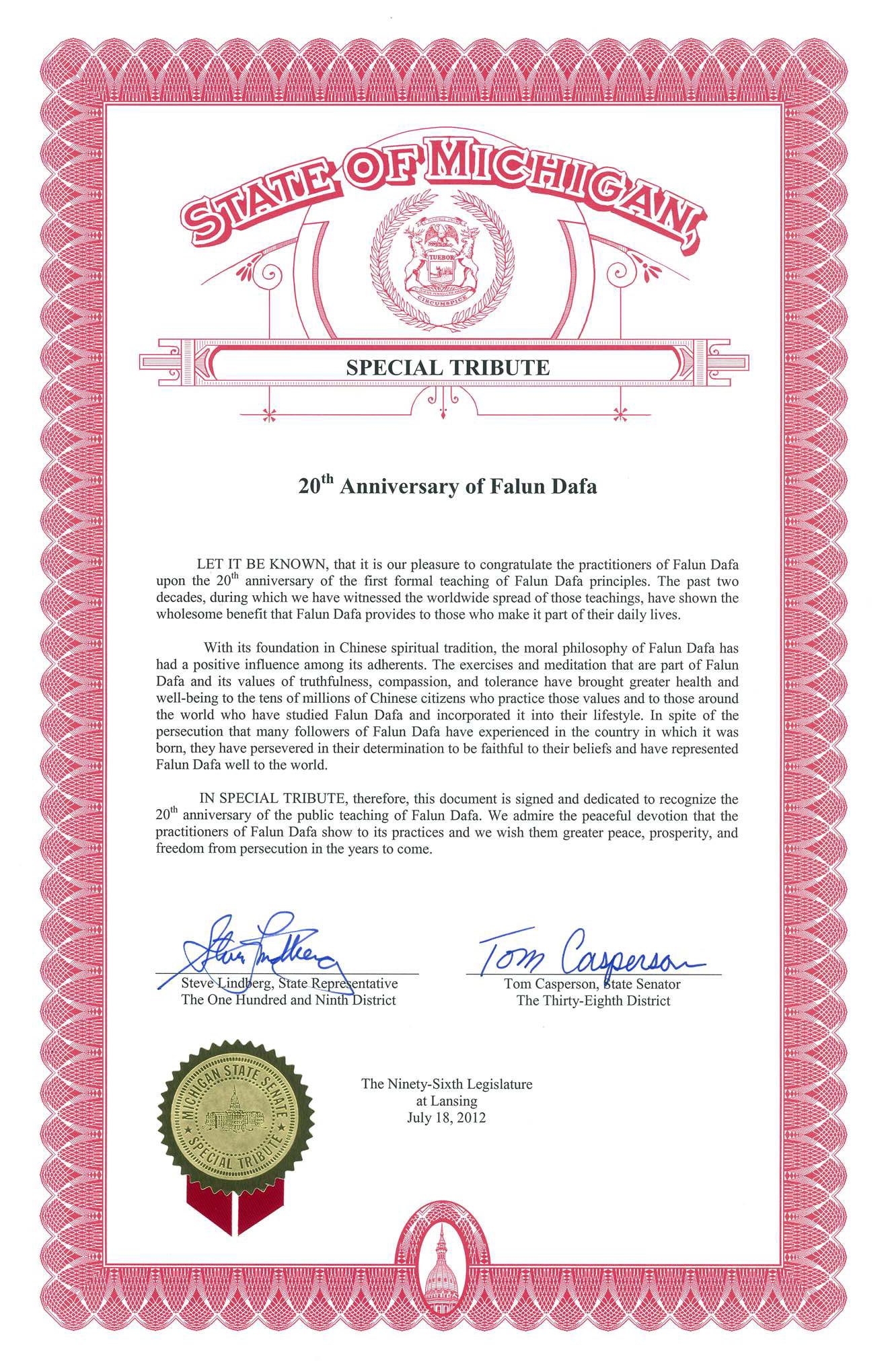 美国密歇根州参众议员特别褒奖法轮大法(图)