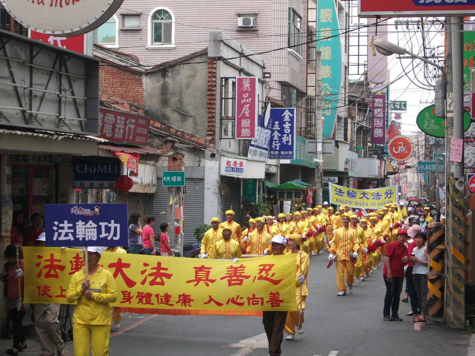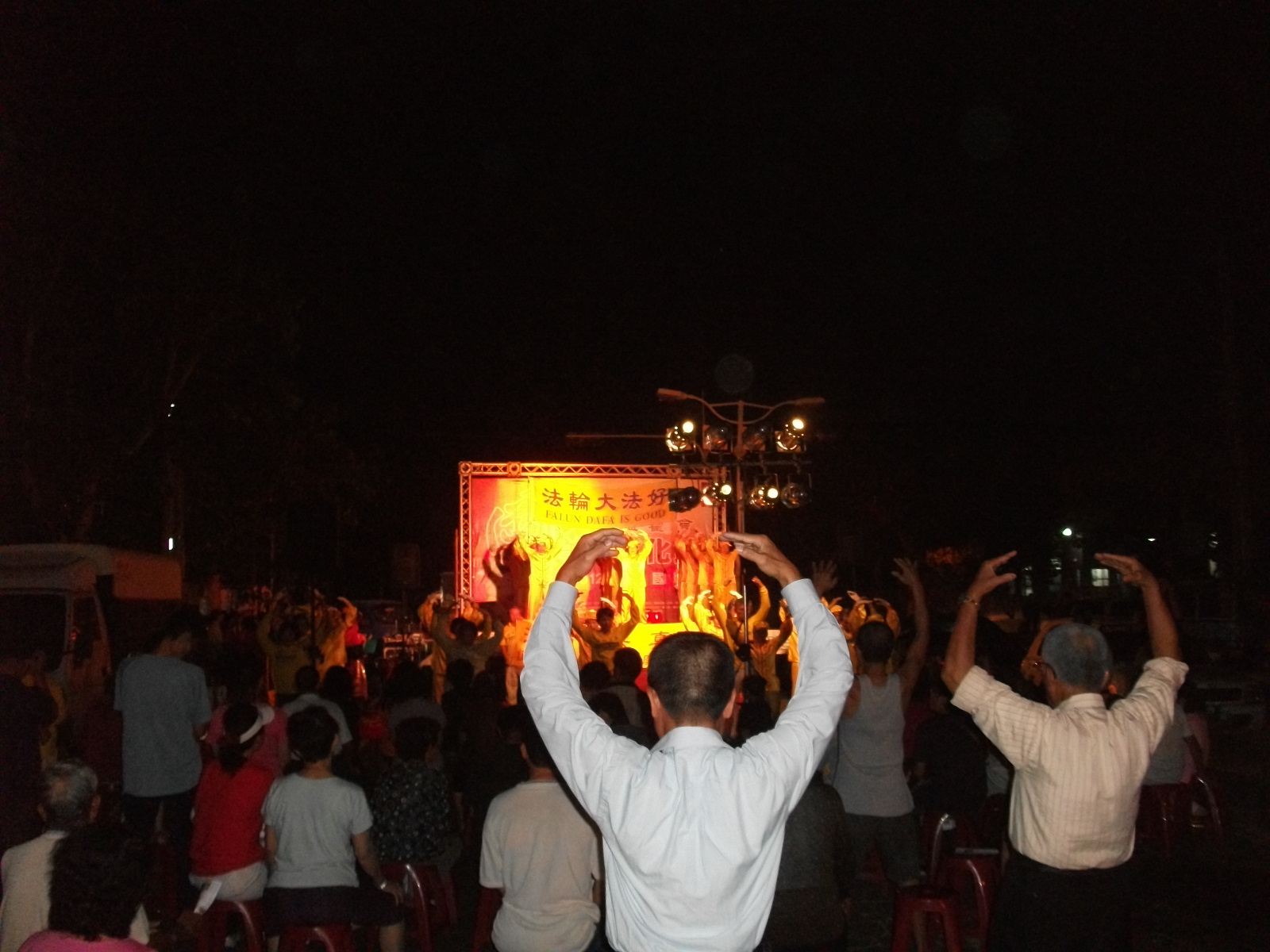 十月二十九日传统篮籗会人潮拥挤,区公所再度邀请法轮功学员组成的腰鼓队在晚上舞台演出。伴随着鼓声,解说人向观众介绍:法轮功是由李洪志先生于一九九二年五月传出的佛家上乘修炼大法,以宇宙最高特性“真、善、忍”为根本指导。五套功法简单易学,动作缓慢圆,没有运动伤害,老少皆宜,学炼后能使身体健康、压力减轻、内心容易平静祥和,小朋友学习会更专注。修炼法轮功祛病健身效果卓著,健保卡使用率降低甚至没再使用,这是普遍现象,给国家省了许多医疗资源。目前全世界已有超过一百多个国家与地区,上亿的修炼人身心受益。