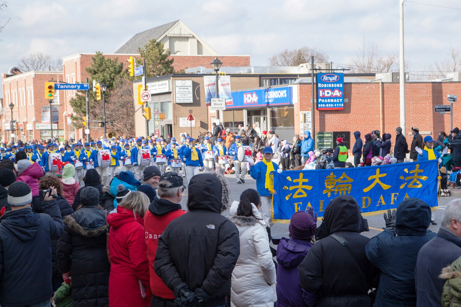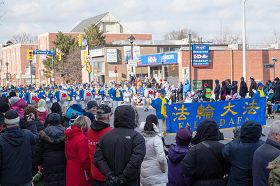 今年是密西沙加第三十五届圣诞游行,有超过六十五个团体参加,各种充满创意性的装扮者沿途向路人发放礼物。多伦多法轮大法天国乐团是众多游行团体中唯一的一个华人乐团,他们身着亮丽的服饰,阵容雄壮威武,一路吹奏着《法轮大法好》、《法轮圣王》和《铃儿响叮当》,增添了节日的喜庆气氛。