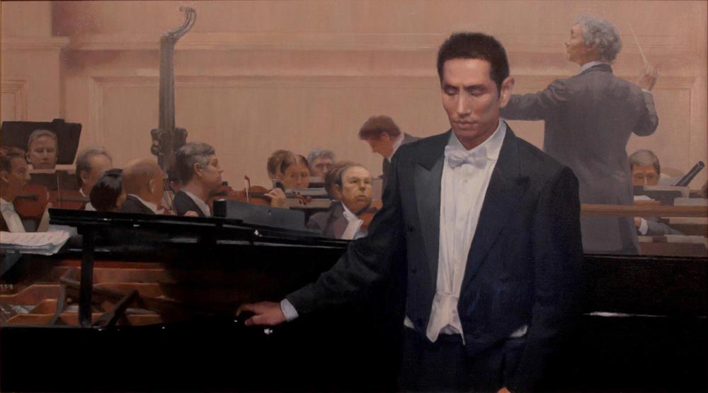 叶上达说:“画中的人是我学声乐的堂弟,我表现的是他准备要唱歌之前的一种神态。一种宁静、慎重,而又很专注的神情。”“用了半年的时间,才完成这一幅作品。”