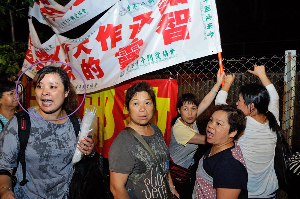 '青年关爱协会成员悬挂诬蔑法轮功的横幅。前左一扎头发女头目正对学员大吼中,她被一位深圳法轮功学员认出是大陆一名女恶犯、女牢霸,二零零零年曾经因为打人被关押在深圳南山看守所,经常在狱警指使下殴打同监的犯人。该名学员因为上访被关押在同一看守所,而认出此人。'