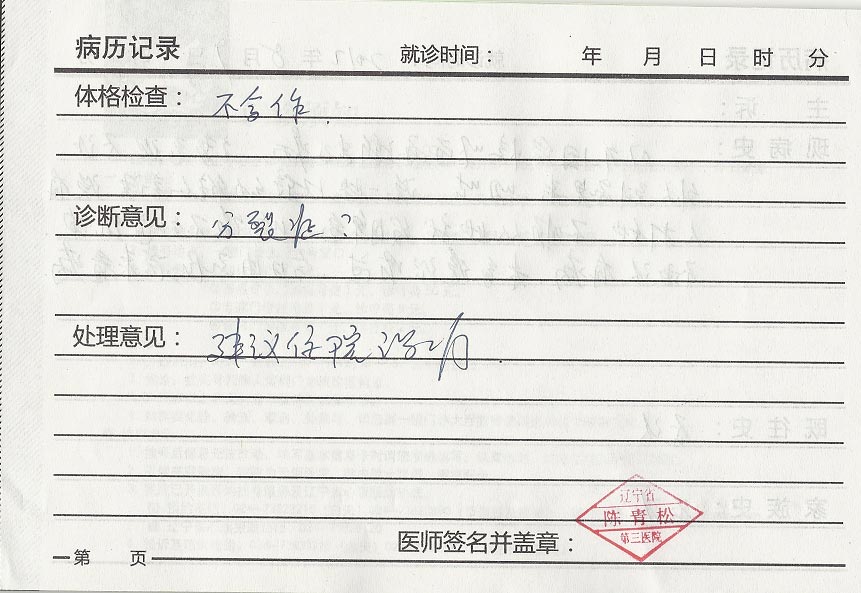 历经这次恶警的群殴与酷刑,我的全身肌肉、锁骨疼痛难忍,之后的两个星期出现了头颤的状态,一年多超体力的奴役工作,又吃不好,我的心脏常会有跳到嗓子眼的感觉,经常心慌,心难受。