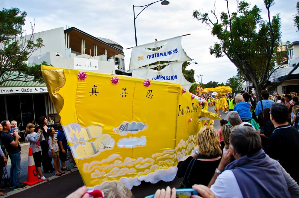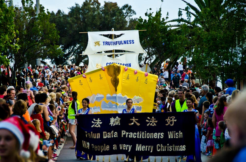 在夕阳渐渐西下之际,西澳法轮功学员的舞龙和腰鼓队与当地其他社团的表演给当地上万的居民与游客带来了圣诞节喜庆的气氛。与往年不同的是,法轮功队伍中出现了一艘金色“法船”造型的花车。船身的前方与白色的帆上都写着“真、善、忍”三个大字,这是法轮功修炼的原则。船身上有英文的“法轮大法”字样,船尾还有一面写有中文“法轮大法好”的旗子。